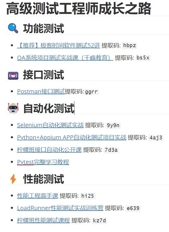 资料涵盖功能测试基础、接口测试原理与实践、App及Web端接口自动化测试框架搭建、持续集成与持续交付(CI/CD)流程配置、性能测试全流程以及真实企业级项目实战案例。