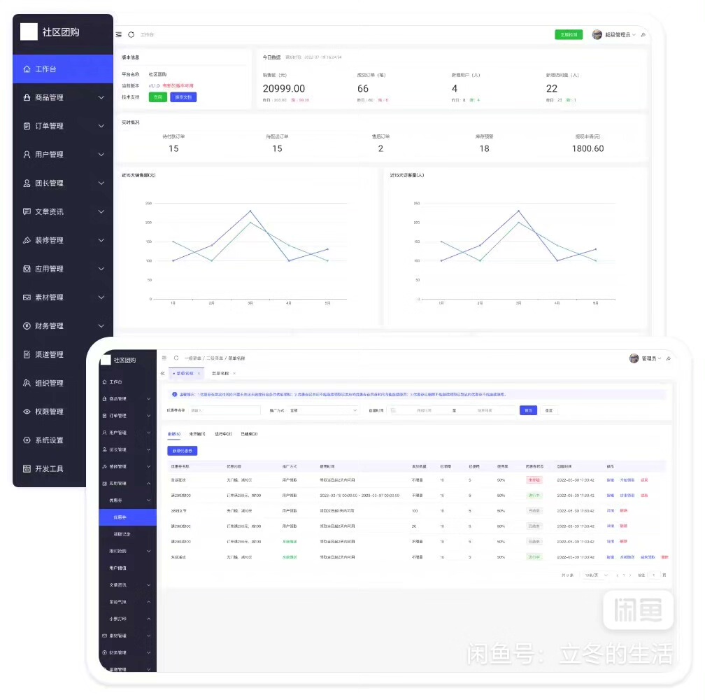 在后台中,您可以查看商品管理、订单处理、团长审核、数据统计等核心功能。