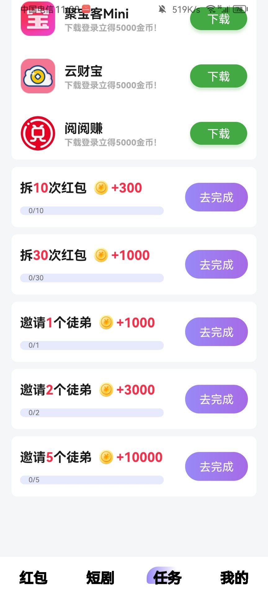 本系统集成了当前主流的用户激励机制,包含红包领取、每日签到、任务奖励等留存手段。