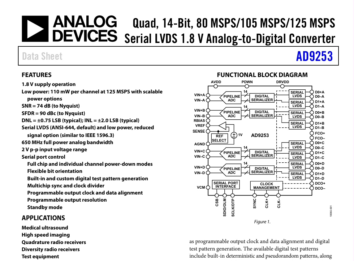 AD9253是一款集成四个独立通道、具备14位分辨率、最高采样速率达125MSPS的模数转换器(ADC),其内部集成了采样保持电路,专为满足低成本、低功耗、小型化及高易用性需求而优化设计,广泛适用于通信、工业测量和便携式设备等领域。