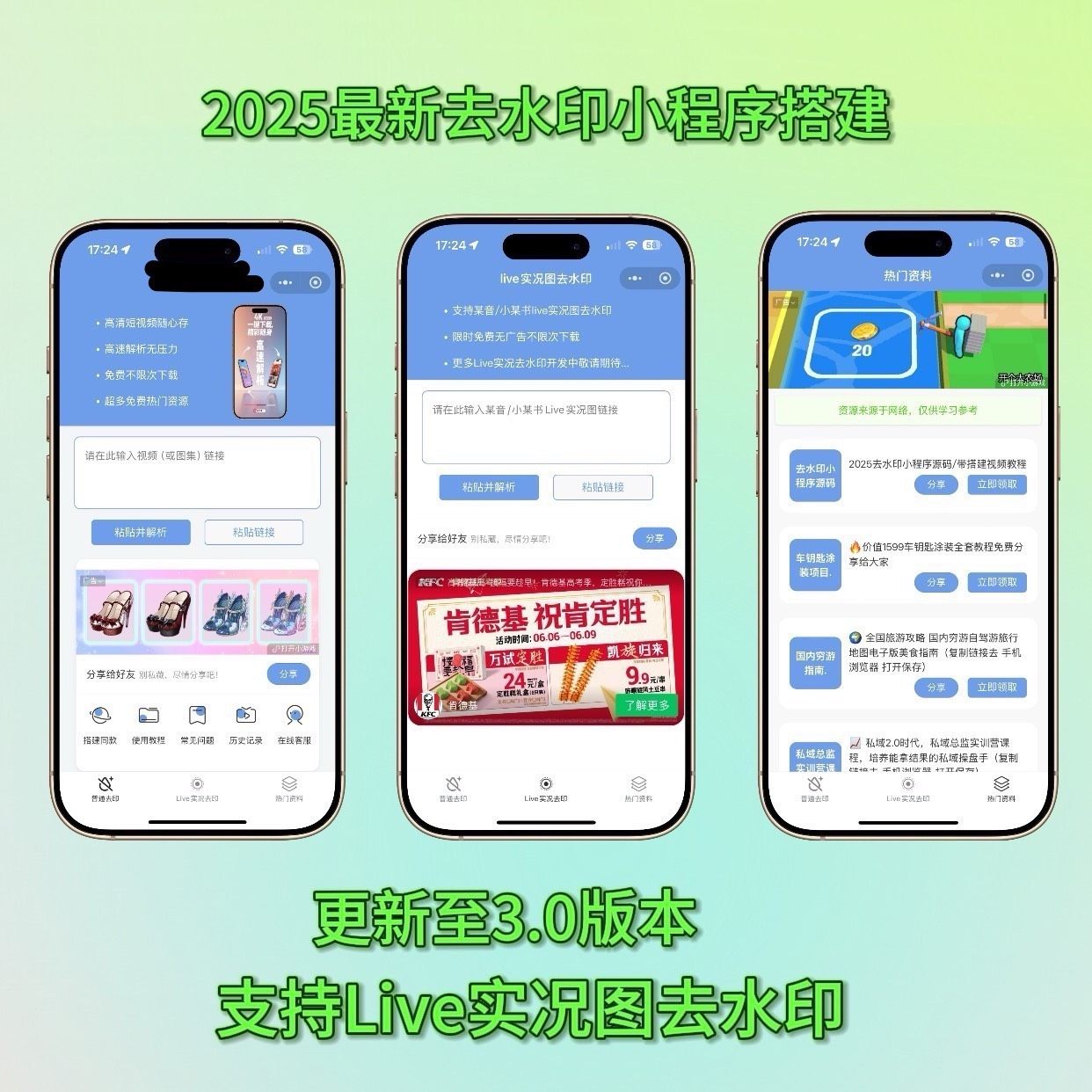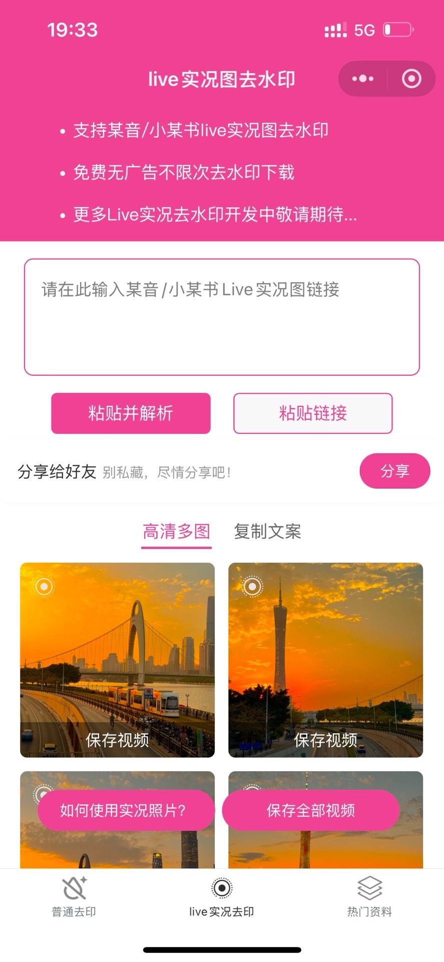 支持iOS Live实况图片去水印处理,行业领先;资源展示页可自定义添加内容,灵活用于网盘类拉新推广活动;界面设计简洁现代,用户体验更佳。