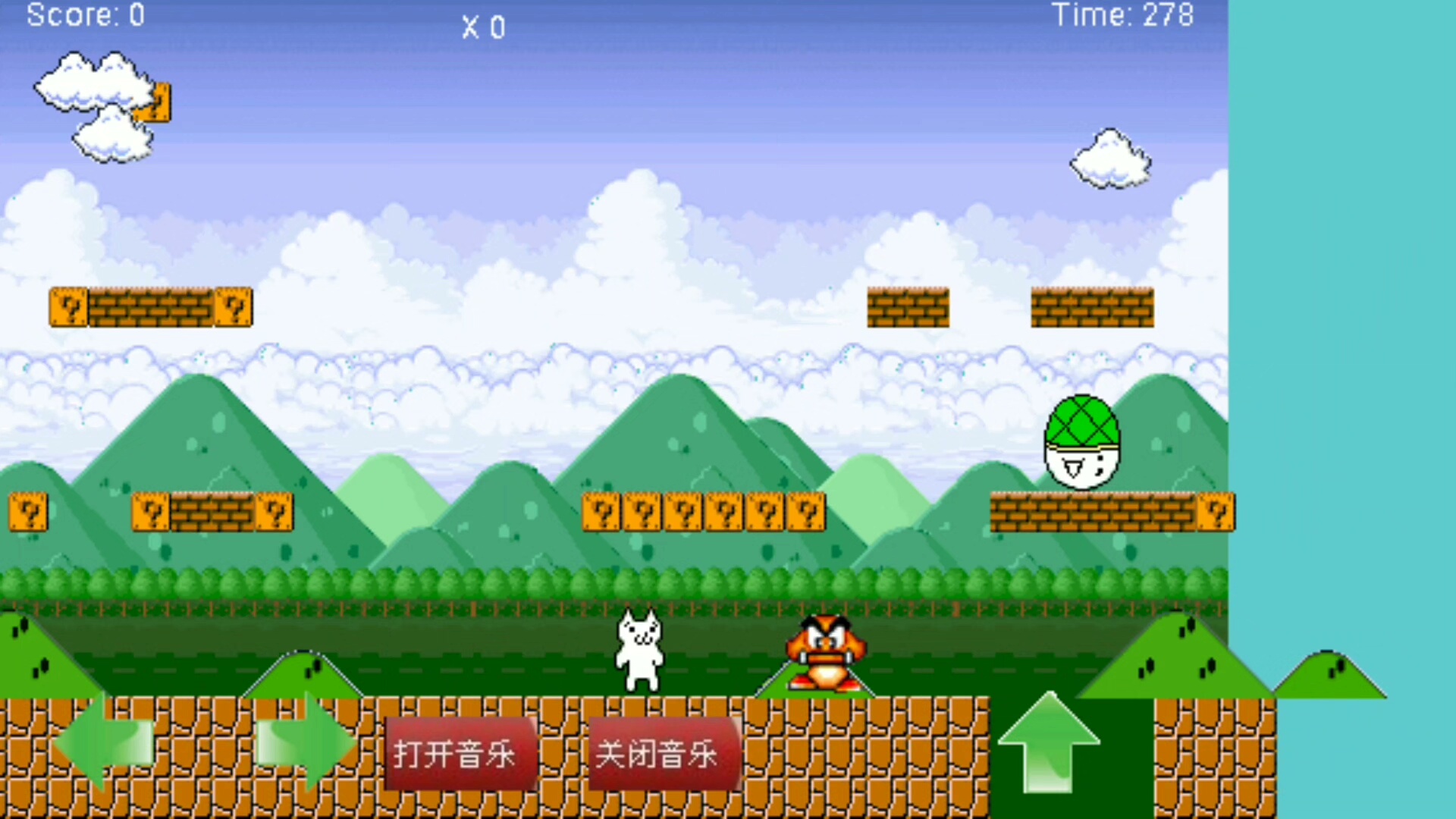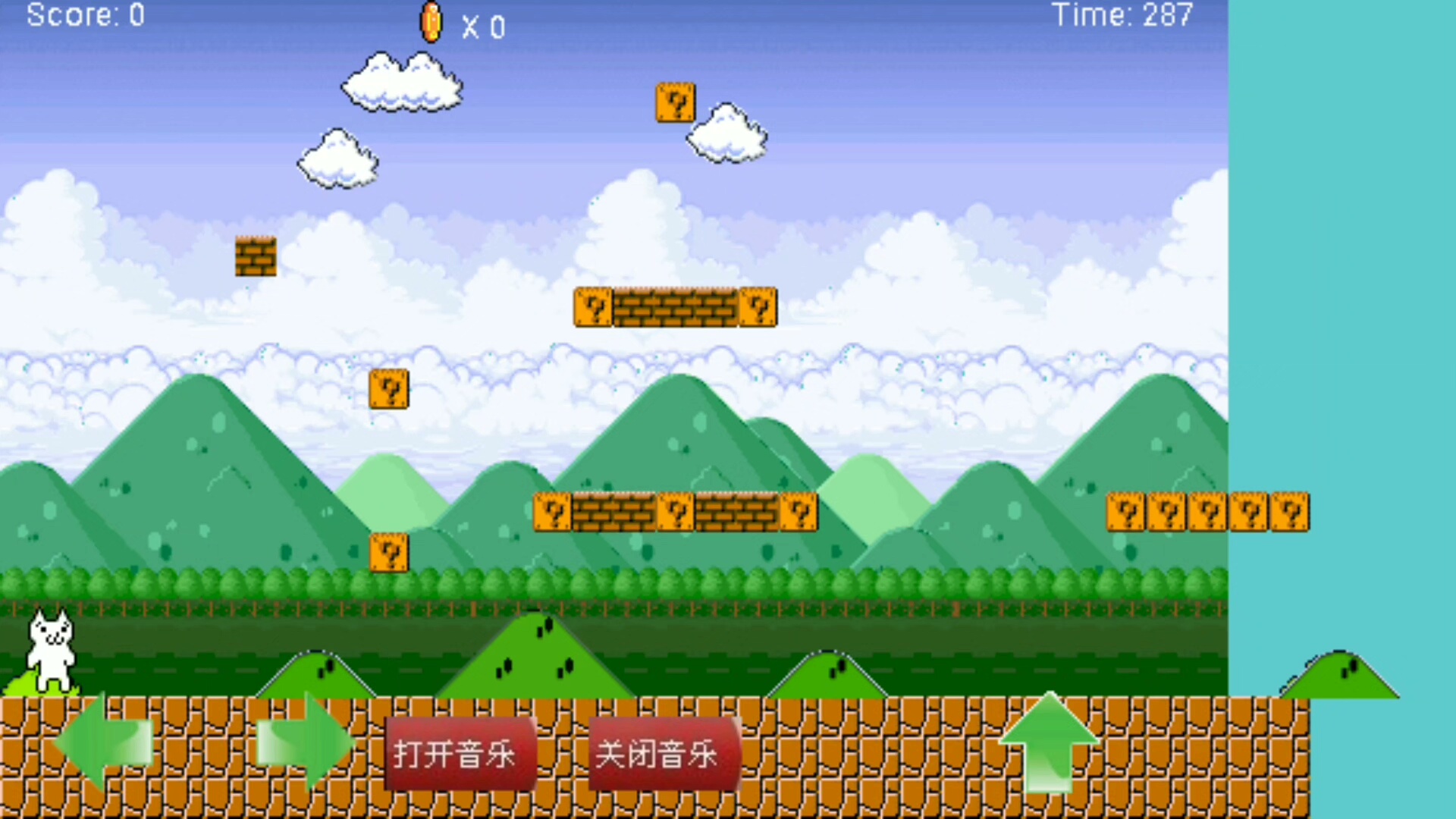 玩家通过点击屏幕上的方向控制按钮(左、右、跳跃)来操控小猫移动和躲避障碍。