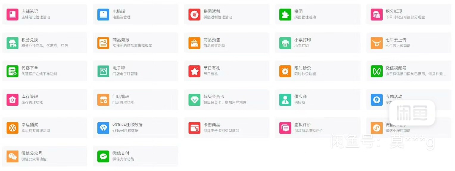 默认内置niuShop官方的全部扩展插件(如拼团、秒杀、分销、会员等级、多规格SKU等),仅排除尚未适配的支付宝小程序相关模块。