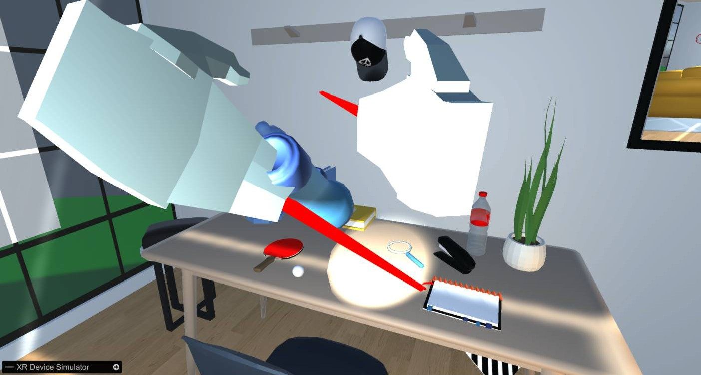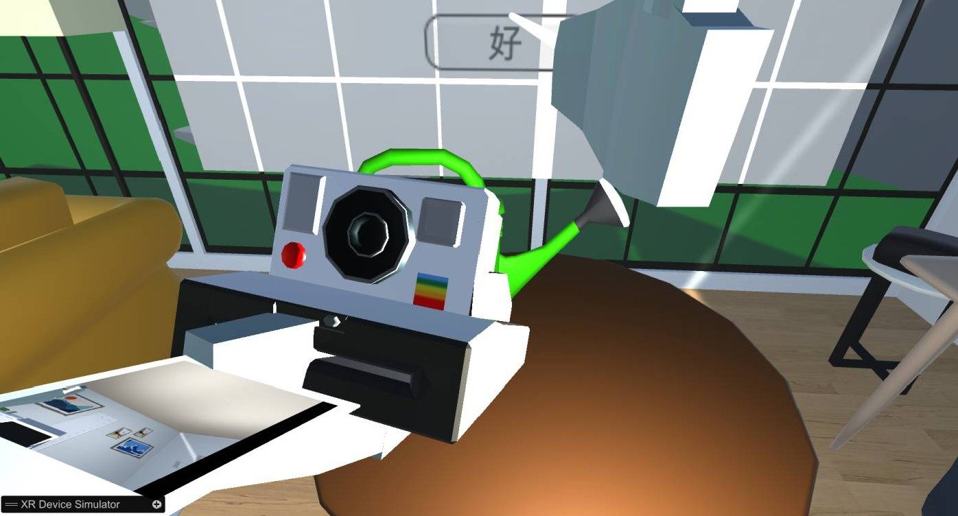 涵盖多项基础但实用的XR交互能力:UI按钮响应式操作、3D空间音频距离衰减系统、拟真倒水动画与粒子反馈、第一人称相机取景+实时拍照并‘吐出’照片实体、帽子悬挂物理锚点、球体自由落体+多材质碰撞弹跳、手电筒开关光照控制、打火机火焰粒子触发、遥控器操控电视(视频播放模块需用户自查MediaPipe/VideoPlayer配置)、以及同步本地系统的实时时钟UI组件。