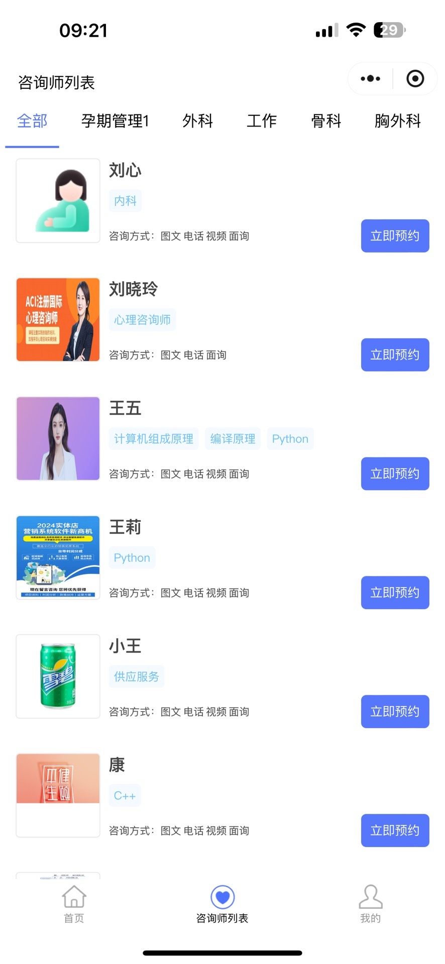 涵盖心理咨询师在线排班与用户自主预约功能,支持时段选择、订单管理、提醒通知;内置轻量级社区问答模块,用户可匿名提问、专家答疑、内容点赞收藏,增强用户粘性与互动活跃度。