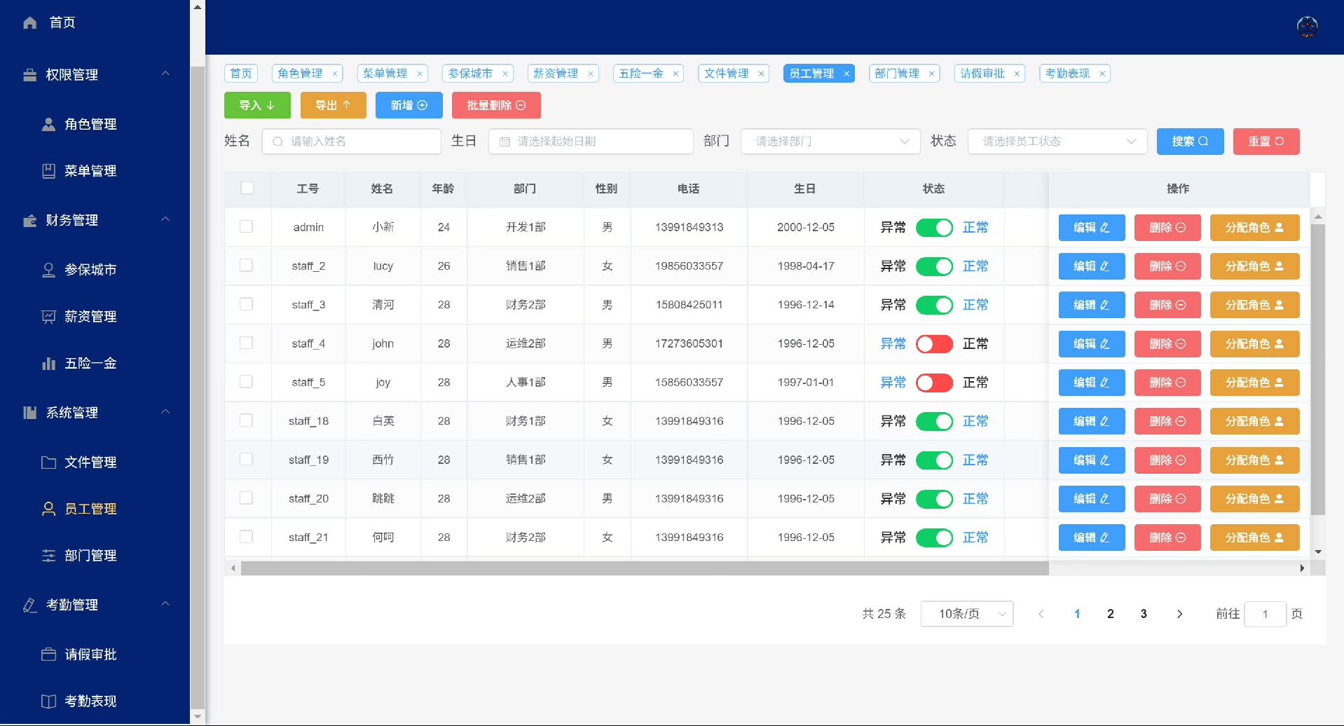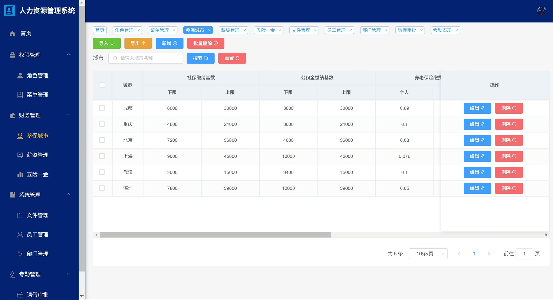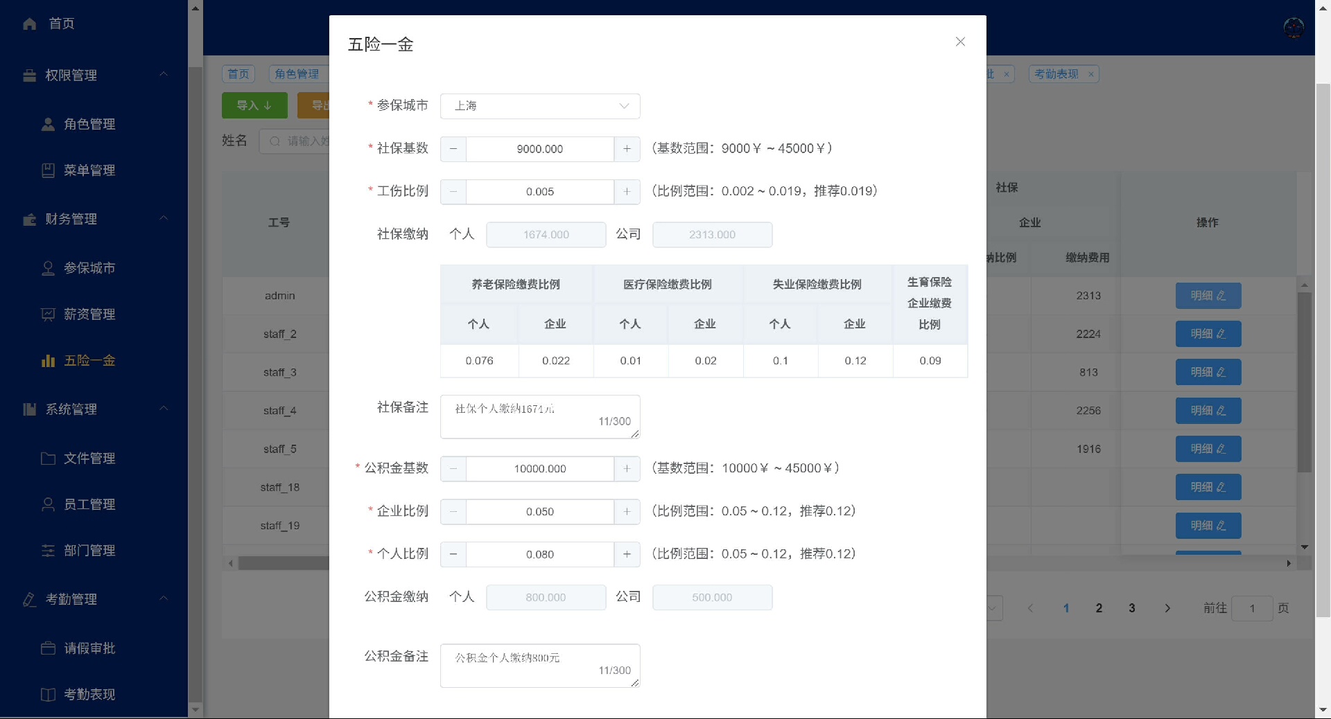 财务管理:涵盖五险一金设置、薪资管理及参保城市配置