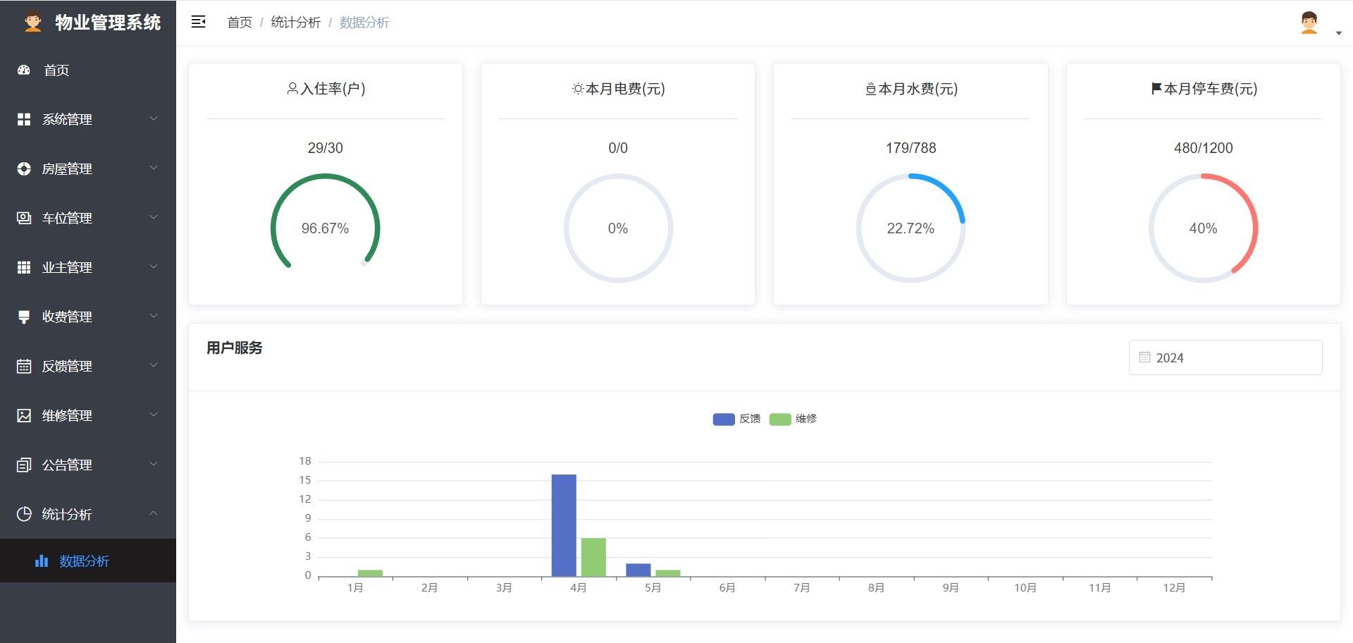 系统为管理员提供可视化数据看板,支持实时查看投诉处理进度、维修工单统计、缴费率趋势分析等关键指标。