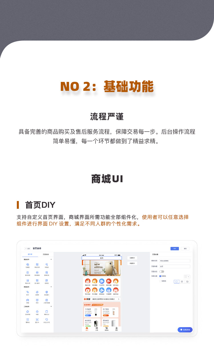 提供首页DIY装修功能,灵活定制界面布局,满足不同品牌视觉需求,实现个性化品牌展示。