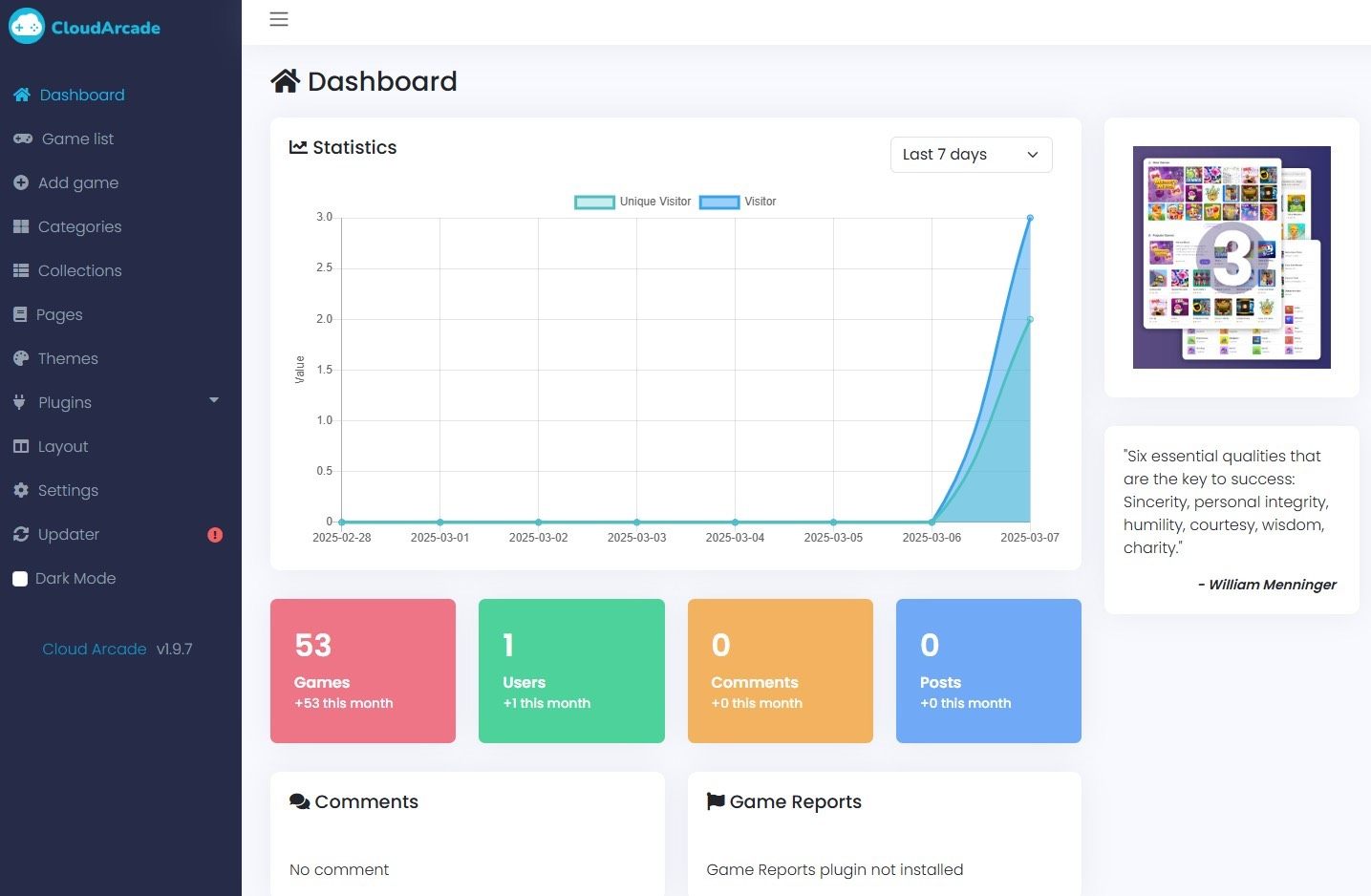 CloudArcade提供界面友好的后台管理系统,用户可轻松完成游戏库维护、主题切换、参数配置及数据统计查看等操作。