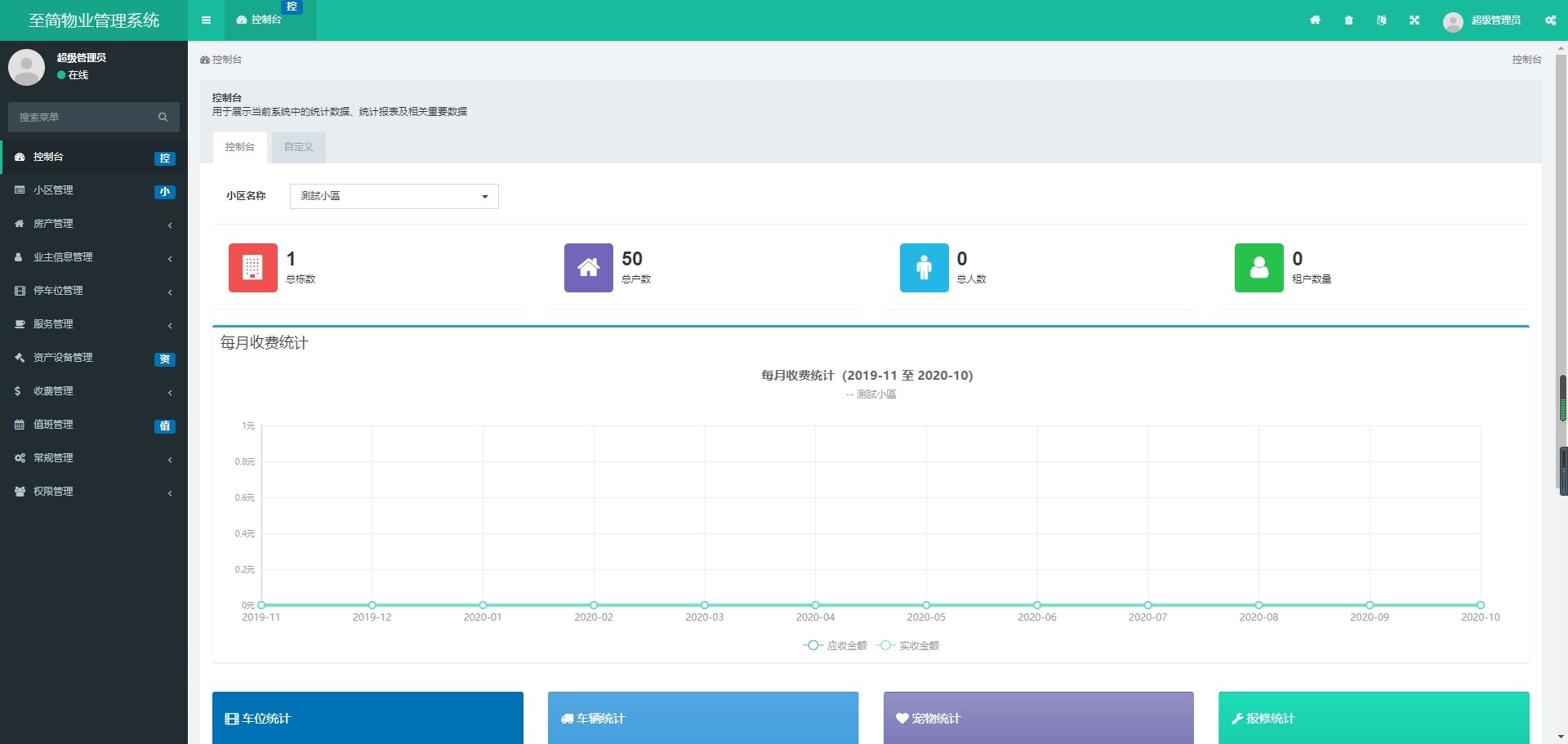 系统内置强大的数据分析模块,以小区维度汇总关键运营数据,包括总楼栋数、总户数、居住人数、租户数量等基础信息,并支持每月收费金额、车位使用情况、车辆登记信息、宠物登记数量以及报修工单统计,帮助管理者全面掌握社区动态。