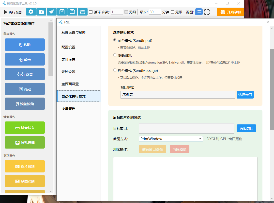 启用后台模式后,无需激活目标窗口,鼠标键盘及识别操作将基于窗口句柄进行,实现无干扰精准控制。