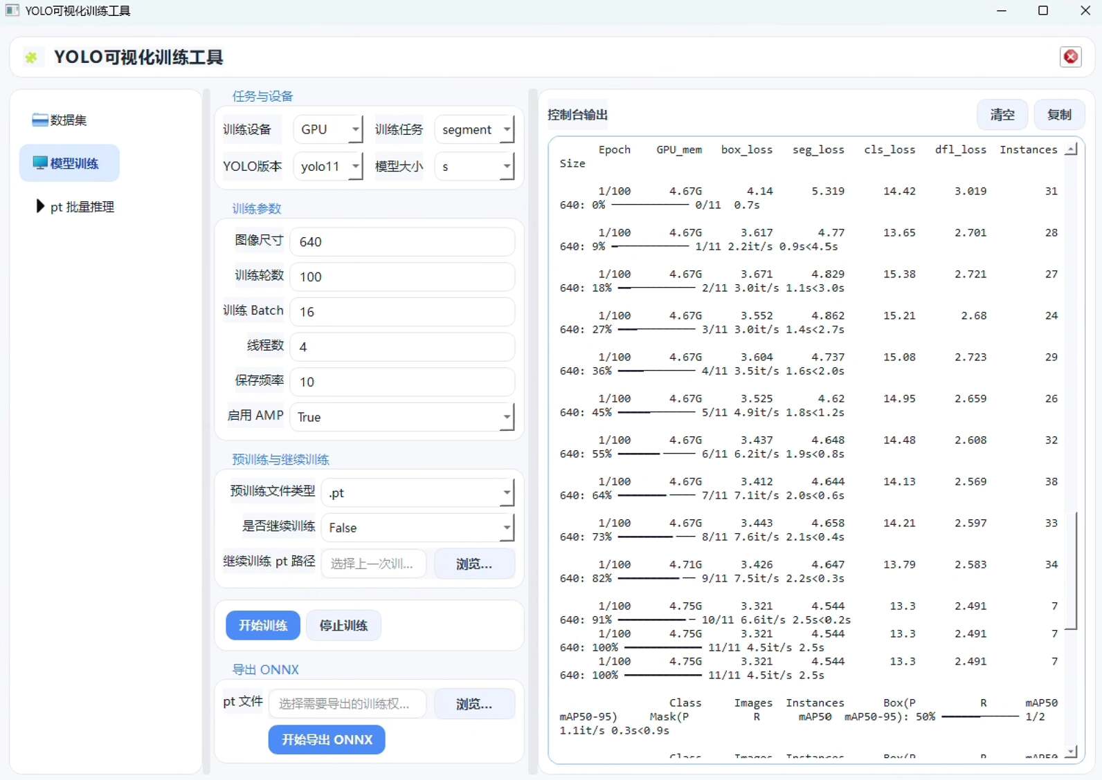 训练完成后,支持一键将模型导出为ONNX格式,便于后续在各类推理引擎中部署使用。
