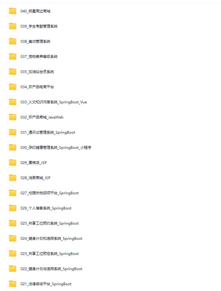 本资源集合了当前企业级开发中广泛使用的多种技术栈,包括基于SpringBoot的后端架构、JSP动态页面、Vue.js构建的现代化前端界面,以及微信小程序项目。