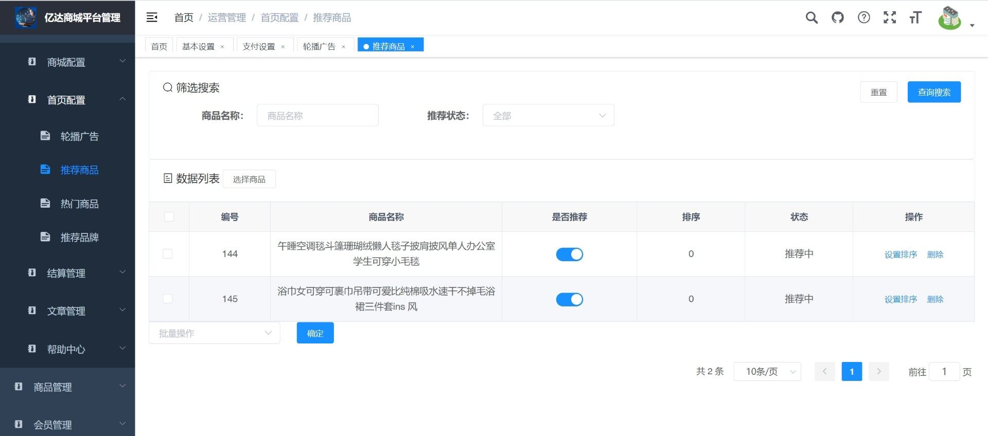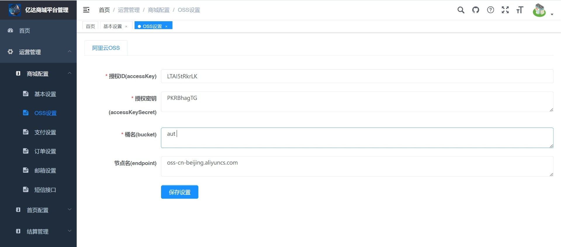 后台涵盖完整的商城管理功能:首页可视化配置(轮播图、推荐商品、热门商品、品牌展示)、商品全生命周期管理(商品列表、新增、分类、品牌、规格、属性、服务设置)、订单管理(订单列表、数据统计)、系统配置(基础设置、OSS存储配置)等。