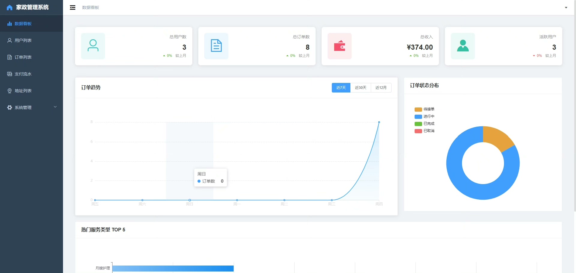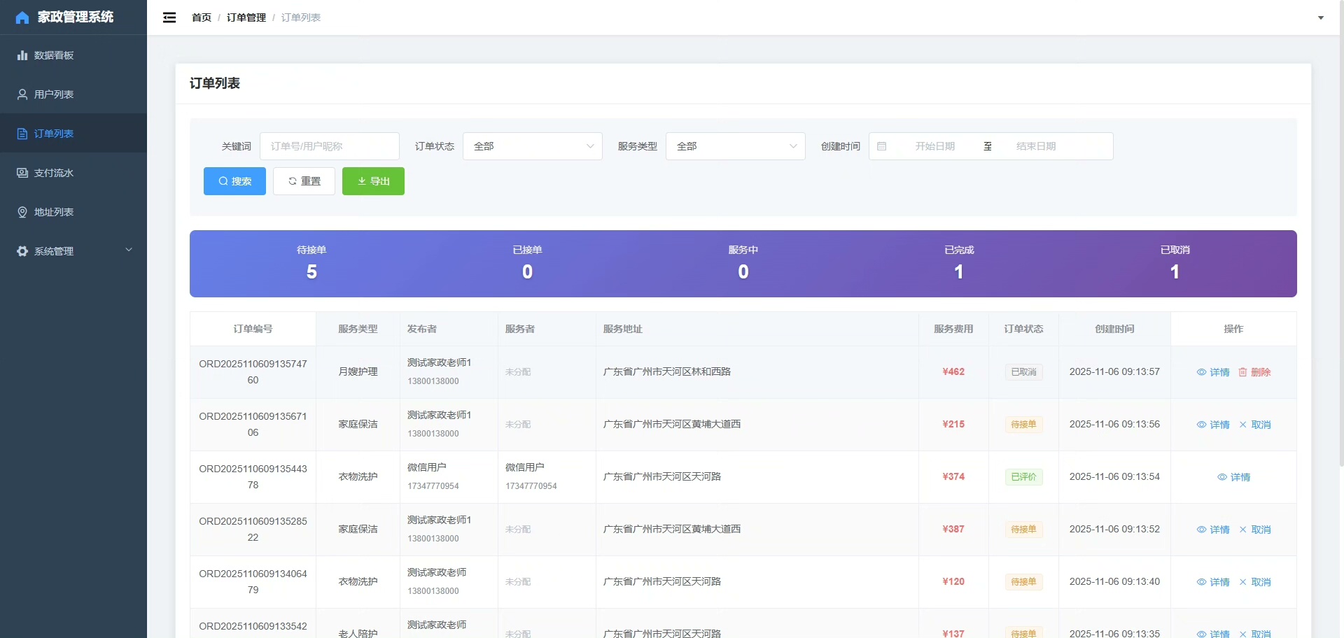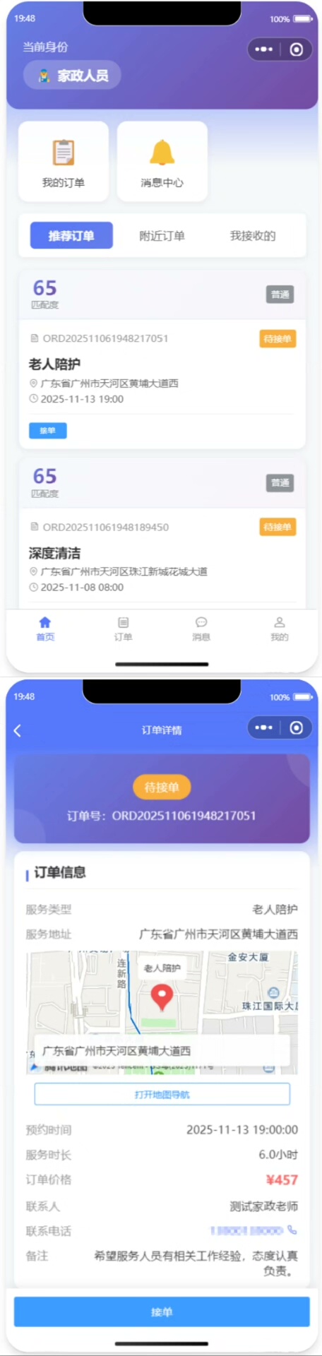 家政老师可在线提交服务需求,详细描述时间、地点、服务类型等信息;家政阿姨可在移动端浏览附近订单,并根据自身情况主动接单。