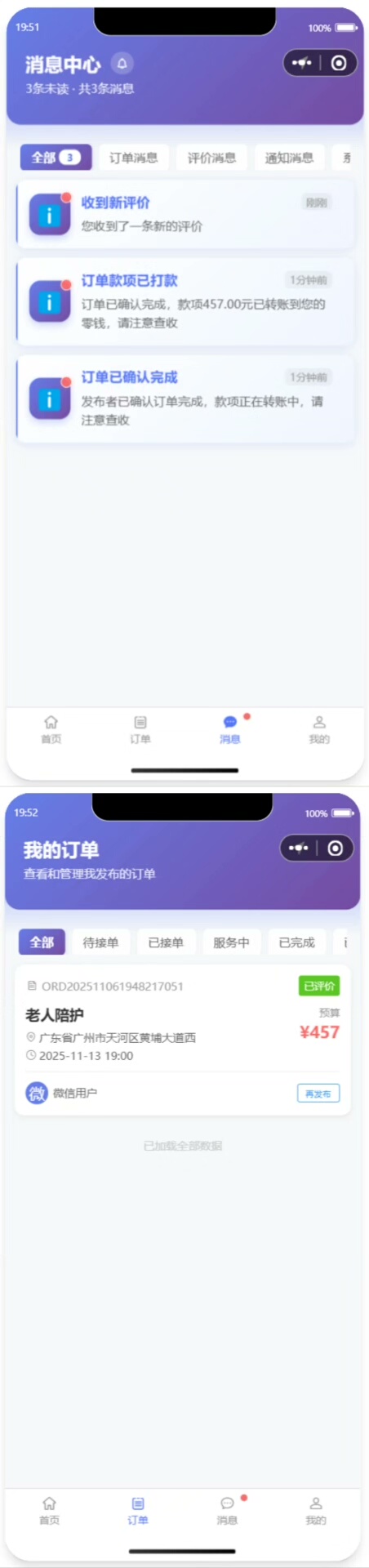 通过WebSocket或微信模板消息实现订单状态更新提醒、新订单通知等即时通讯功能,让用户随时掌握服务动态,提升交互体验。