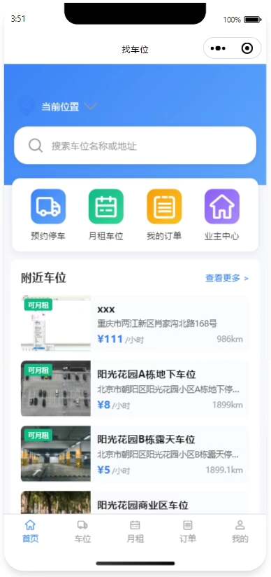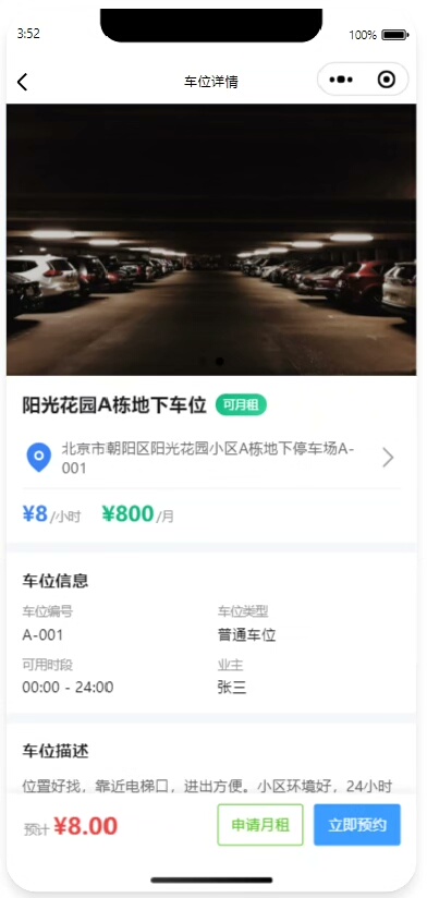 车主端功能:支持微信一键登录,浏览附近可用车位,按位置或时间搜索车位信息,查看详细停车点介绍,发起预约请求并完成在线支付(含模拟支付环境),管理个人订单记录,提交月度租赁申请。