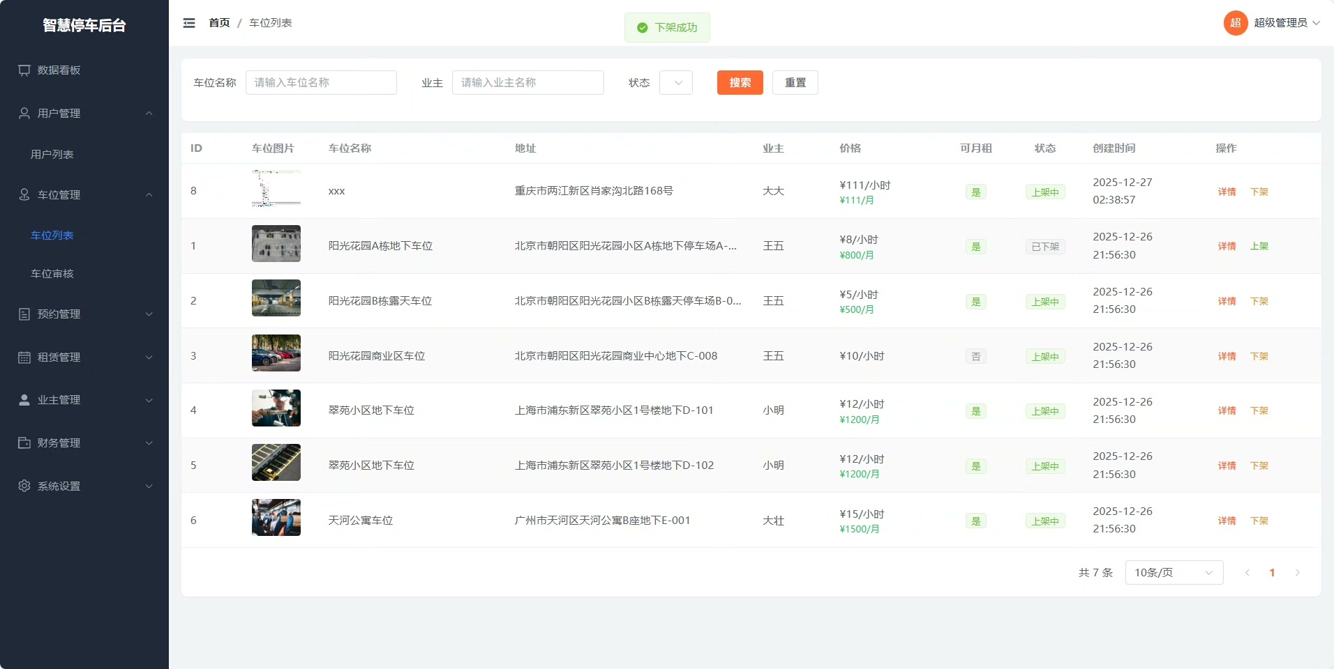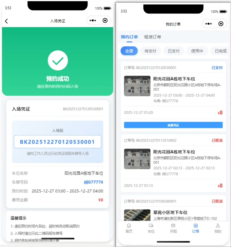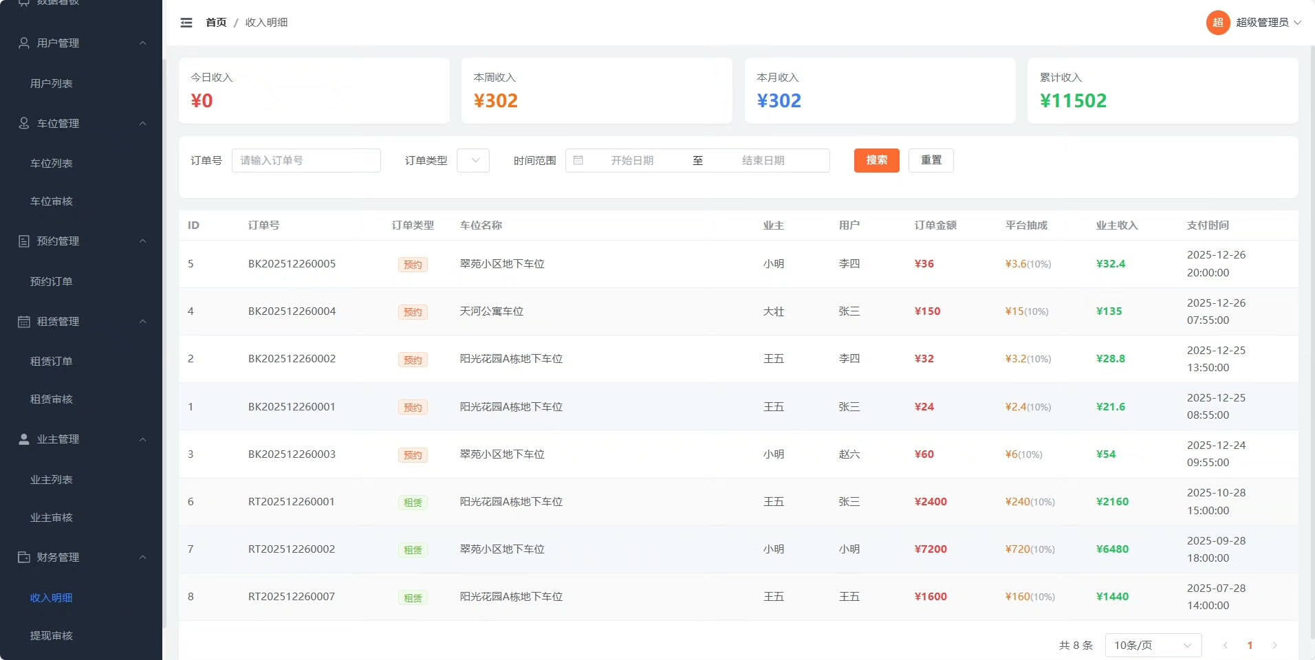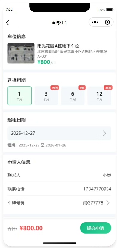 用户可通过小程序实现车位预约与月租申请,业主可空闲车位获取收益,平台管理员统一审核与监管。