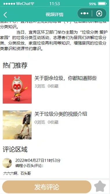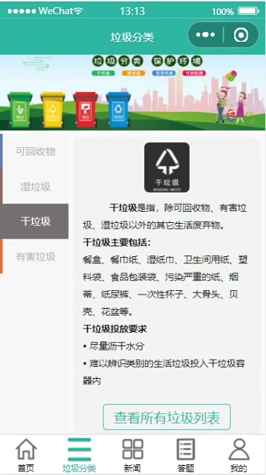 系统内置垃圾分类宣传视频播放模块、相关新闻资讯展示区以及每日答题挑战功能,增强用户参与感和环保意识。