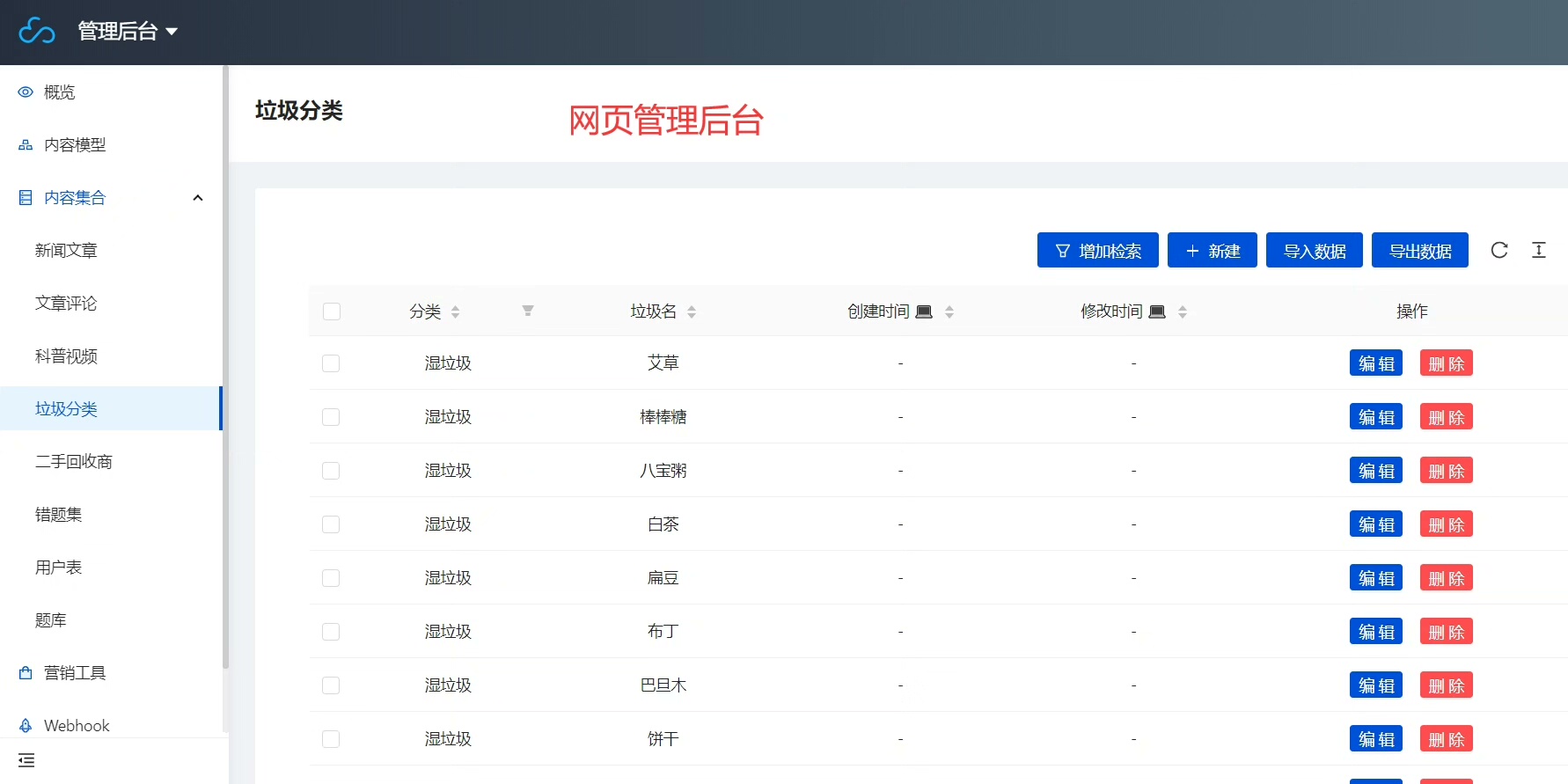 提供基于网页的管理后台,管理员可轻松和管理垃圾分类相关的图文内容、科普视频、配套学习笔记及题库信息。