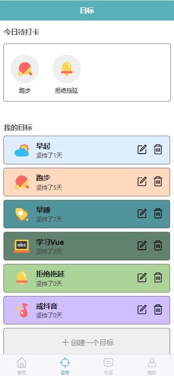 支持目标打卡提醒、详情查看、编辑与删除操作。