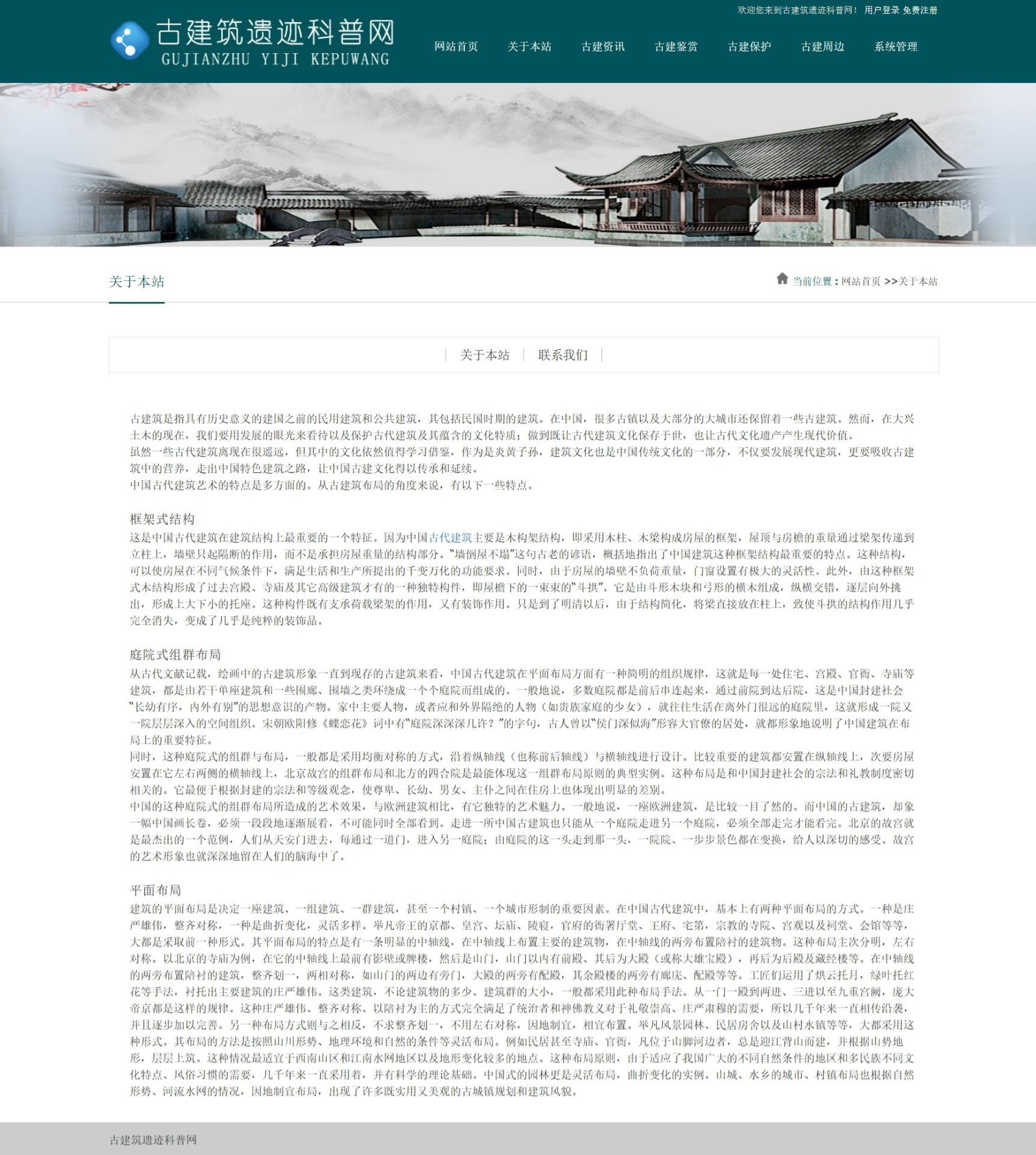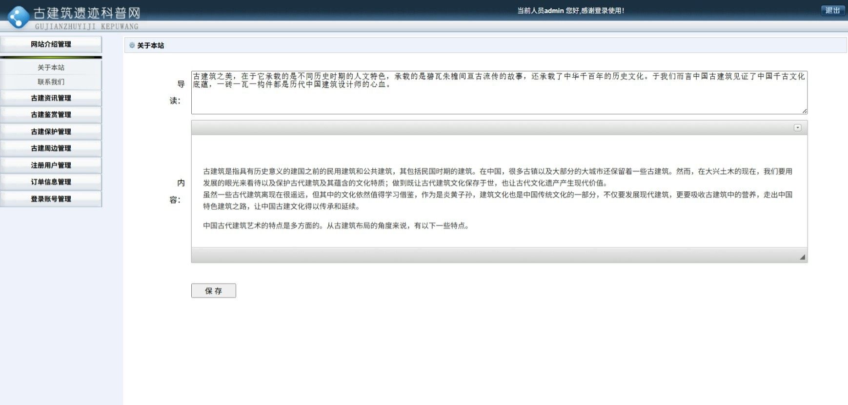 本系统是一款专为古建筑文化普及设计的信息展示类Web应用,采用主流的C#语言结合ASP.NET技术框架进行开发,后端数据库选用SQL Server,整体架构稳定可靠,具备良好的可维护性与扩展性。
