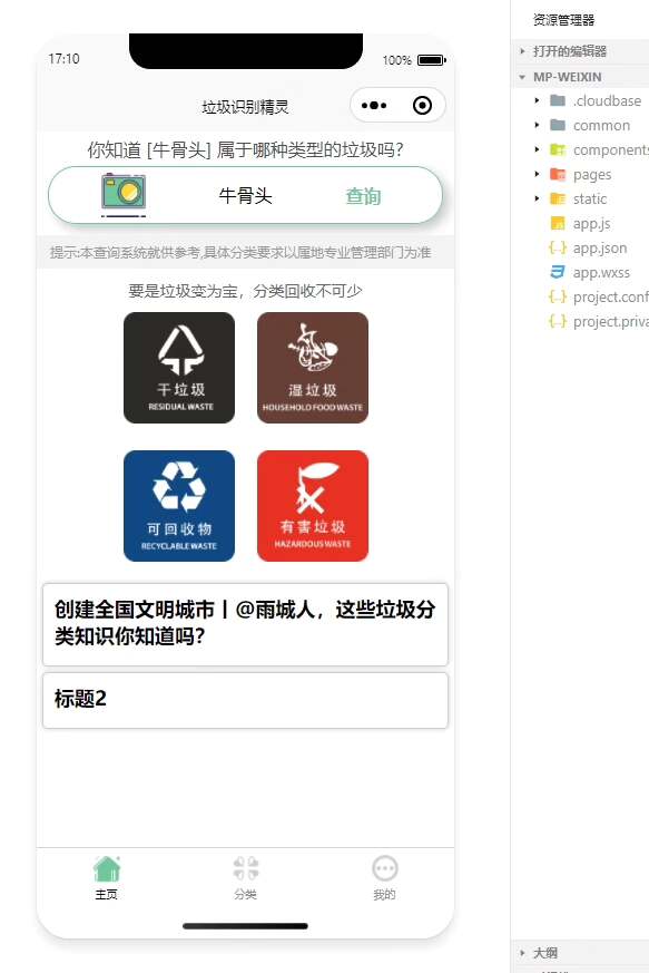 本垃圾分类小程序采用主流开发工具构建,后端基于Java语言实现,结合MySQL关系型数据库进行数据存储与管理,前端使用微信开发者工具完成小程序界面的搭建。