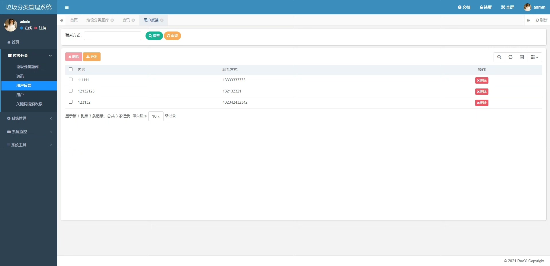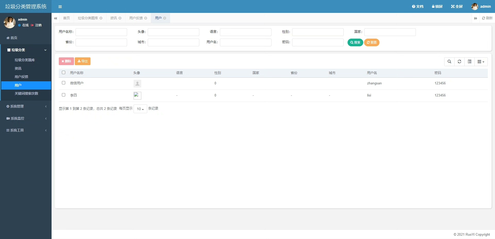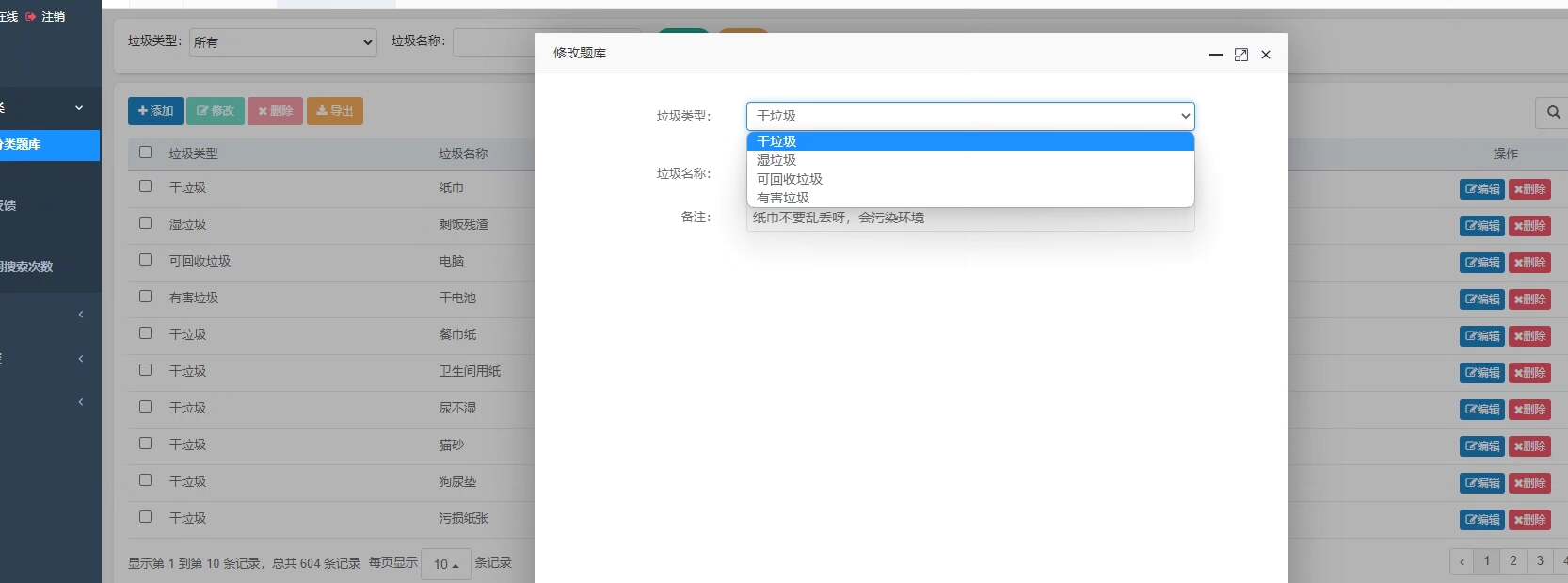 管理员模块支持对用户信息的统一管理、垃圾类型的数据维护以及垃圾分类相关文章和知识内容的与编辑。