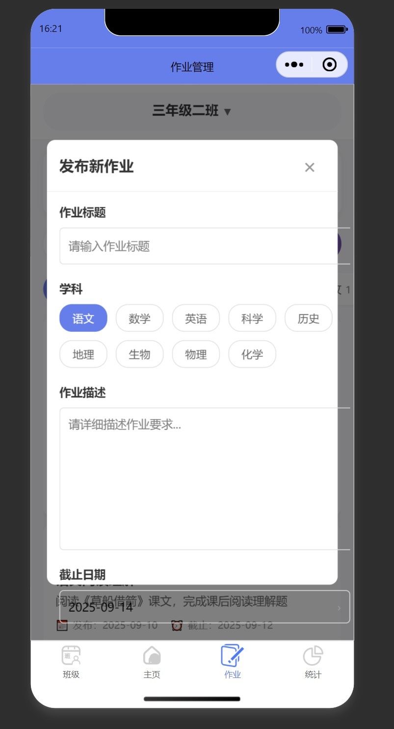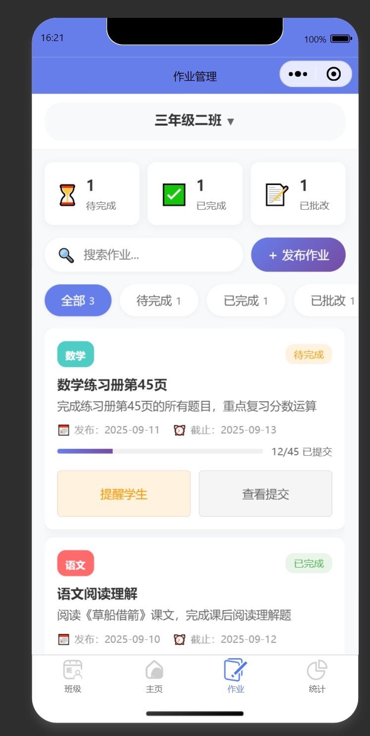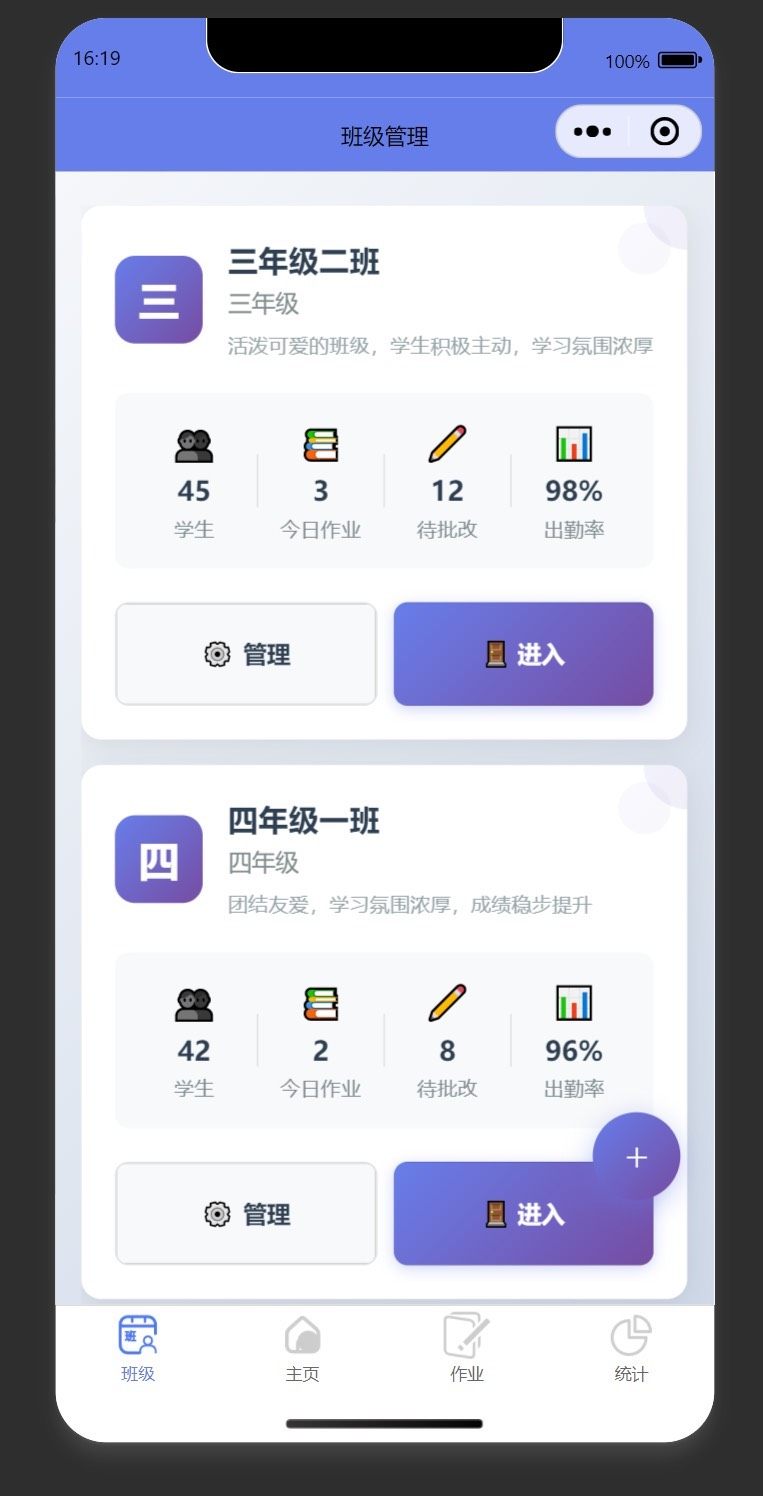 采用卡片式班级展示布局,信息层级分明;作业状态通过彩色标签标识,状态一目了然;统计数据以柱状图、饼图等形式可视化呈现;配合悬浮操作按钮与流畅过渡动画,带来出色的交互体验。
