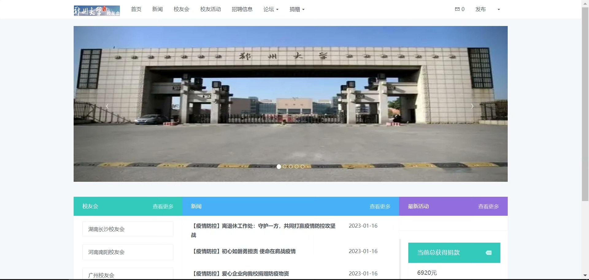 首页展示重要资讯与动态,设有新闻浏览、校友会介绍、校友活动报名、招聘信息查看、论坛交流以及在线捐赠等核心模块,全面提升校友参与感与归属感。