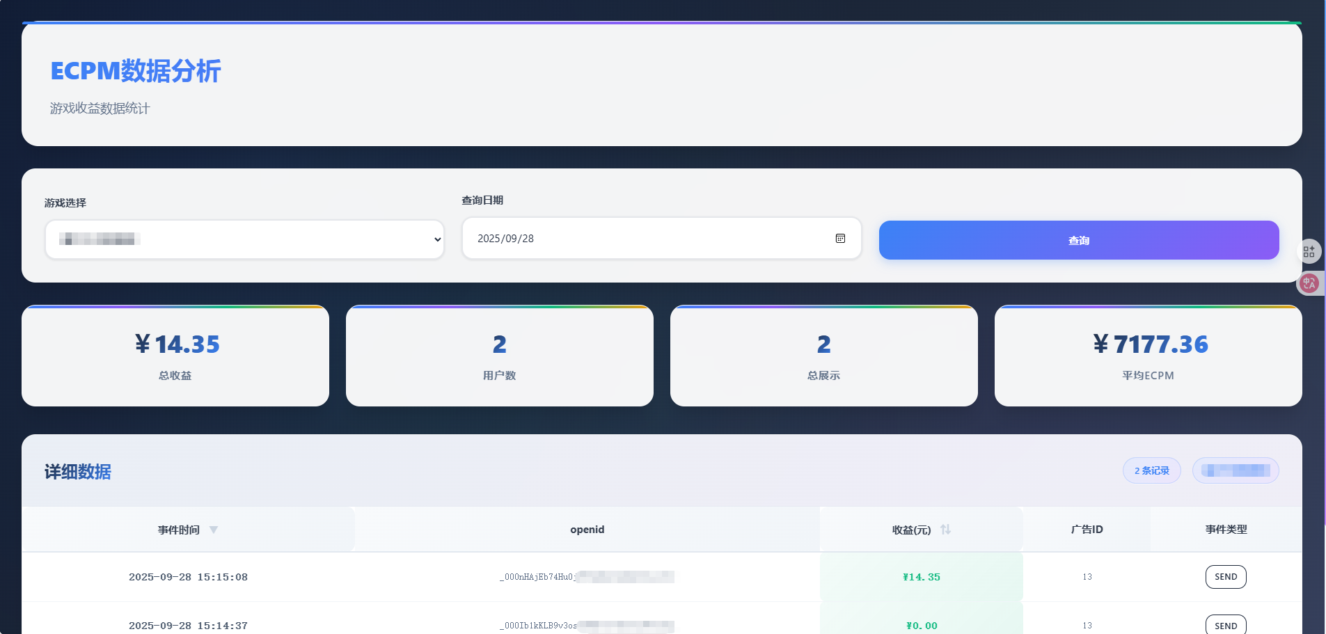 本系统为专为抖音小游戏开发者打造的ECPM数据分析后台源码,集成了高效的数据采集与可视化功能,帮助运营者精准掌握各游戏的变现表现。