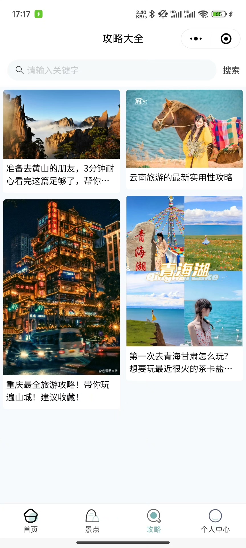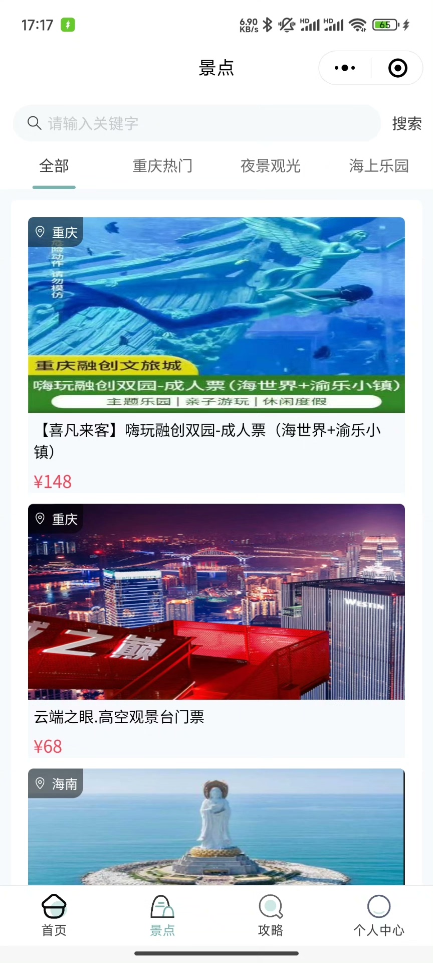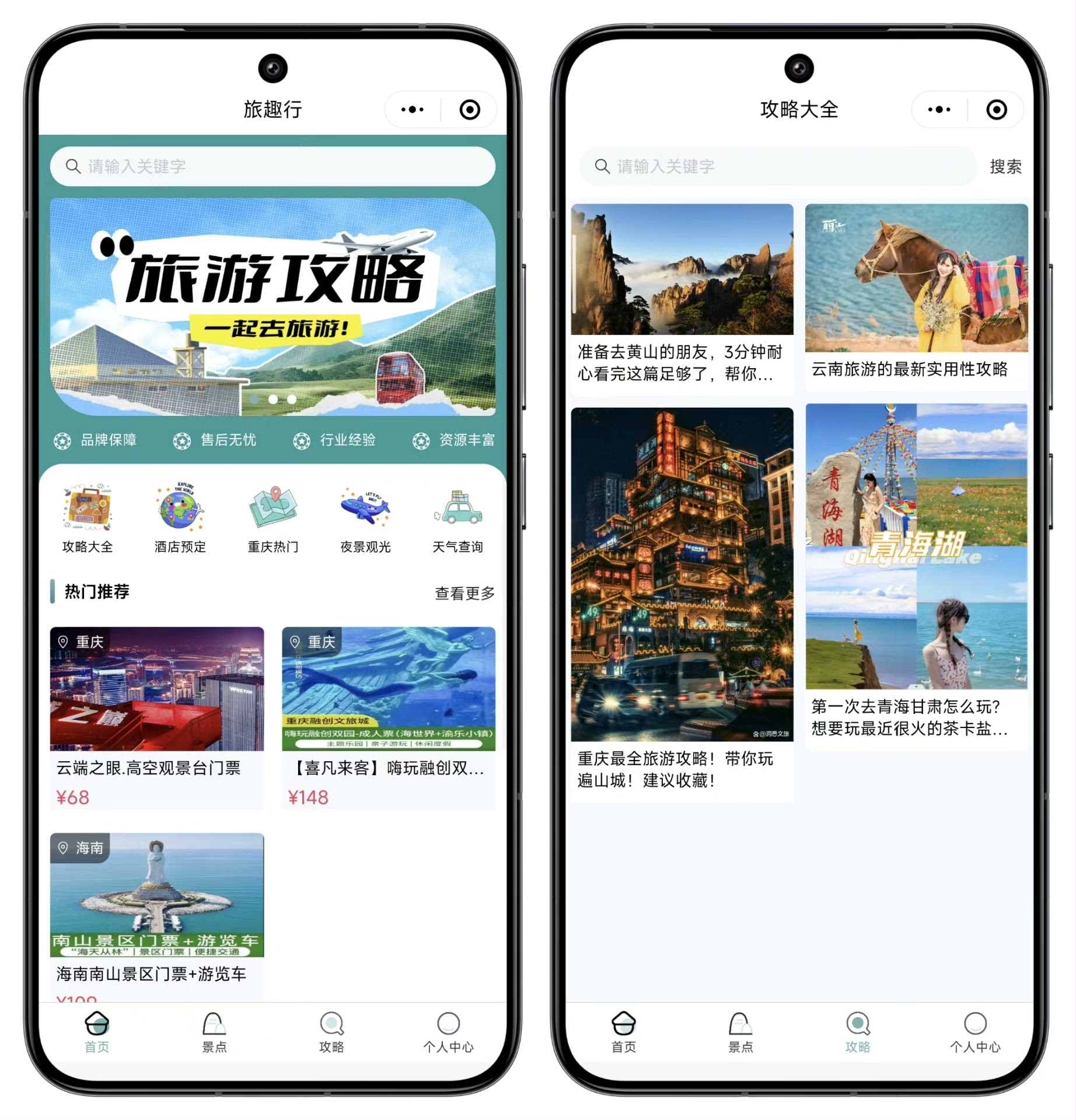 系统涵盖多个实用功能:用户可通过小程序浏览热门旅游景点并完成在线购票操作;支持城市酒店搜索与预订流程模拟;集成第三方天气API,提供目的地实时气象信息;同时内置旅游攻略内容管理系统,便于展示图文并茂的出行建议与行程规划参考。