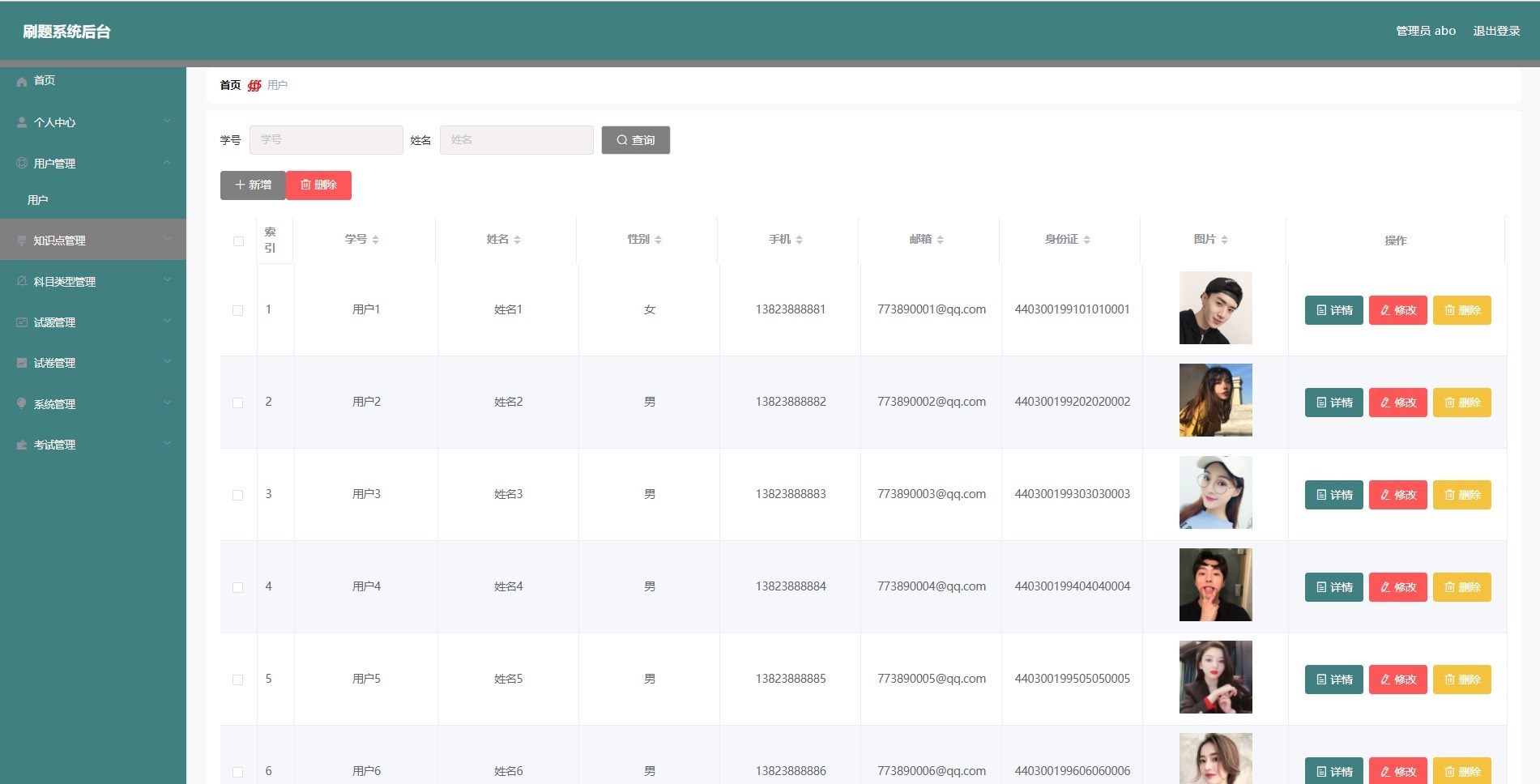 管理员拥有全面的后台管理权限,涵盖试卷管理、题目录入、用户信息维护、科目分类设置以及考试安排等核心功能,支持对题库的增删改查与批量导入导出。