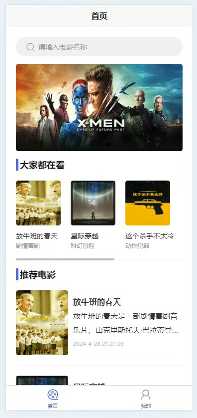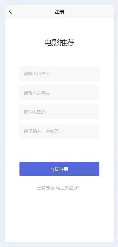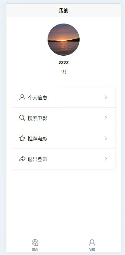 该项目共包含八个主要页面:首页用于展示热门影片入口;推荐页智能推送个性化内容;搜索页支持关键词查找;详情页展示电影具体信息;我的页整合用户操作入口;个人信息页管理个人资料;登录页与注册页完成身份验证流程。