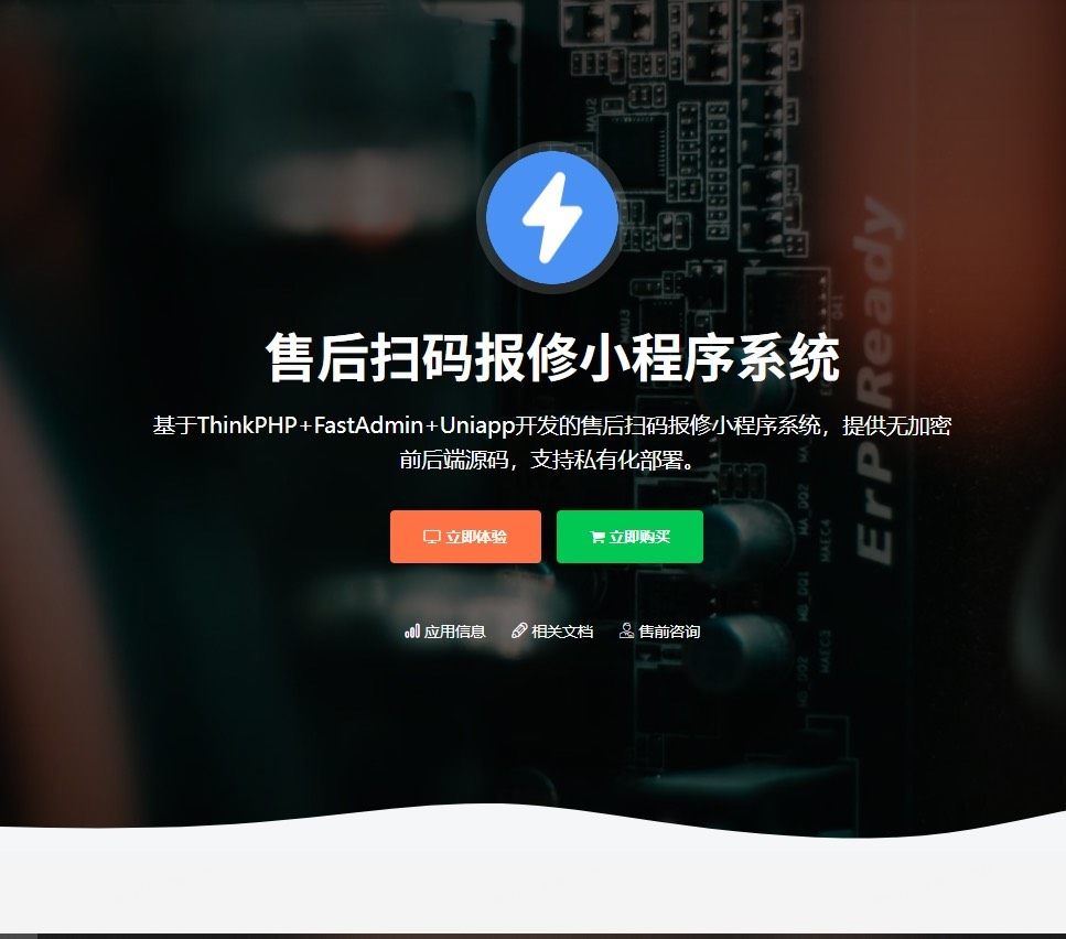 本系统是一款基于ThinkPHP、FastAdmin与Uniapp技术栈构建的售后扫码报修小程序,版本为1.1.0高级版。