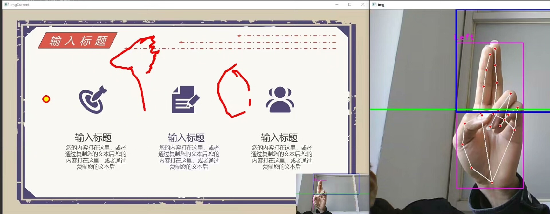 系统通过MediaPipe手部模型实时检测手掌21个解剖学关键点(包括指尖、指关节及掌心),完成高精度坐标定位、动态着色渲染与姿态判别,为后续手势逻辑映射奠定坚实基础。