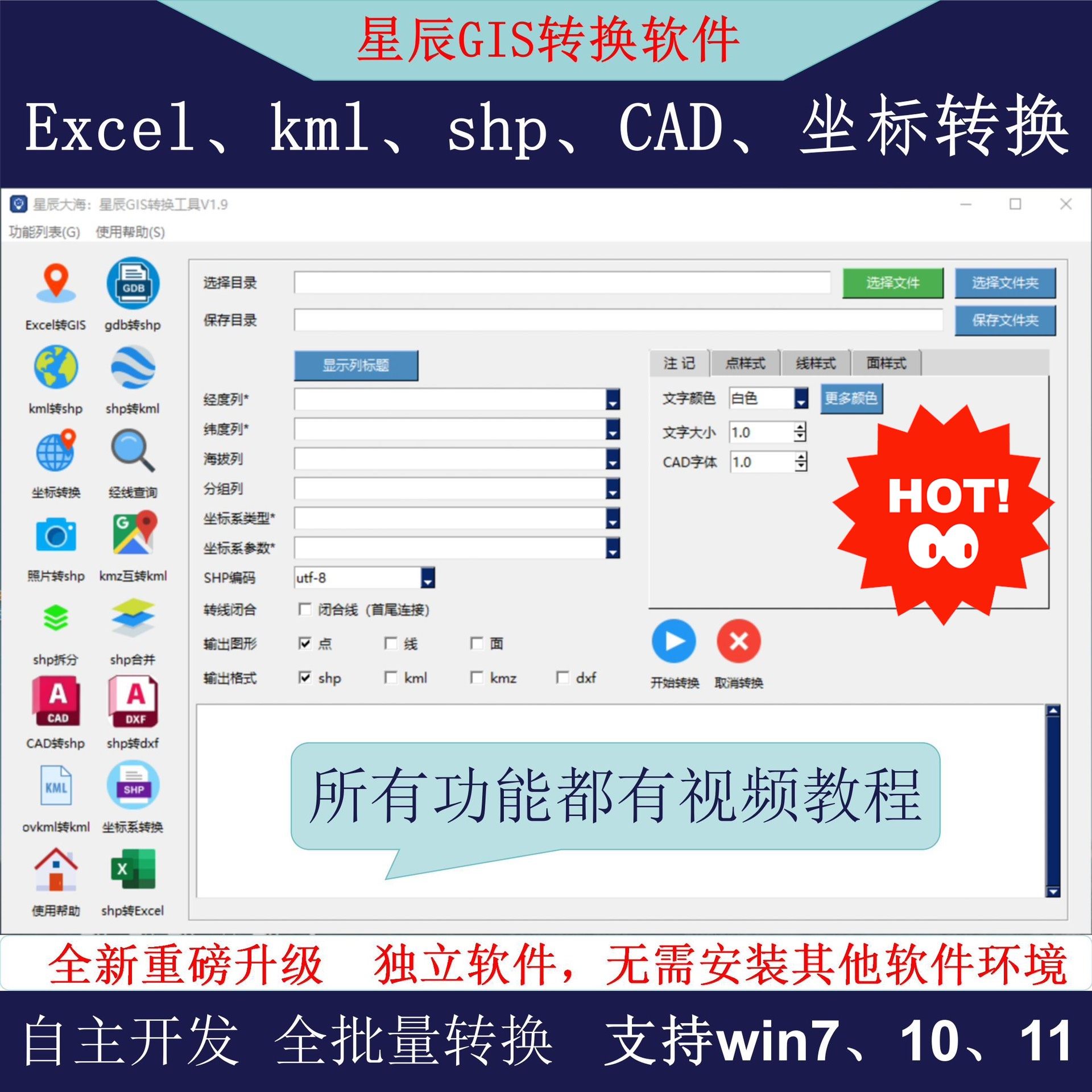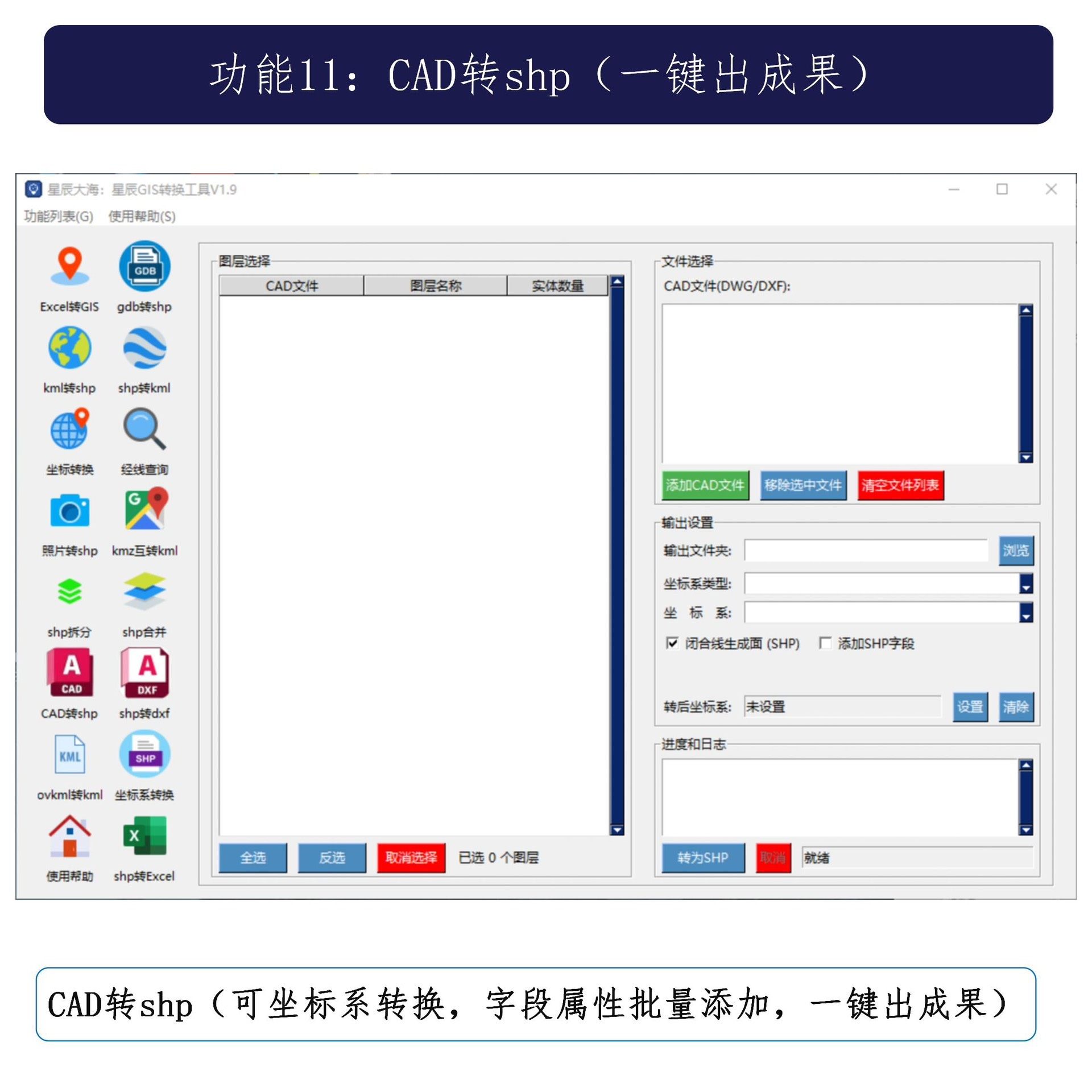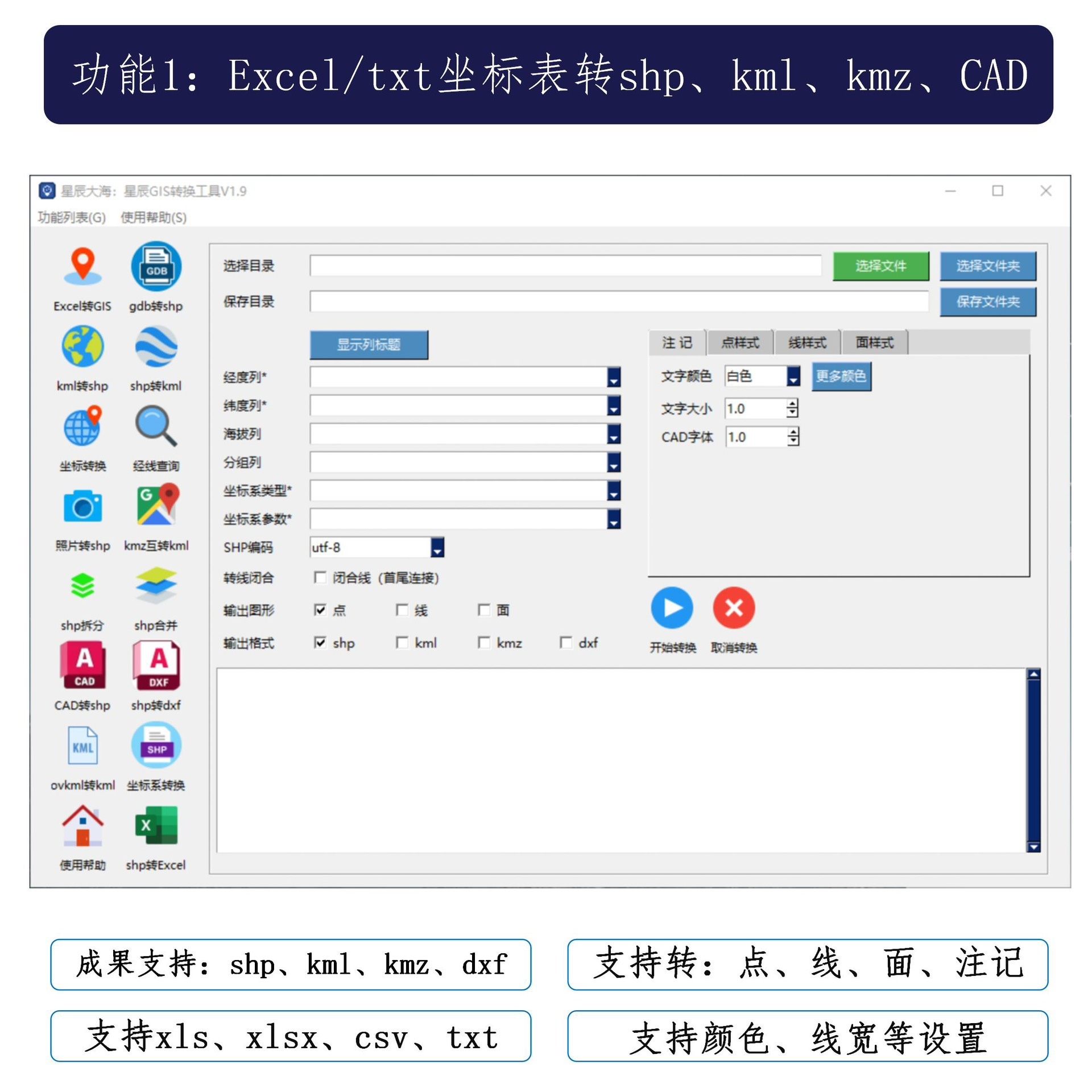 星辰GIS转换助手是一款专为地理信息系统用户打造的多功能数据处理工具,支持多种格式之间的高效批量转换,涵盖Excel、TXT、CAD(DWG)、SHP、KML、KMZ等主流GIS与测绘数据格式,满足外业数据整理、内业成图、平台发布等全流程需求。