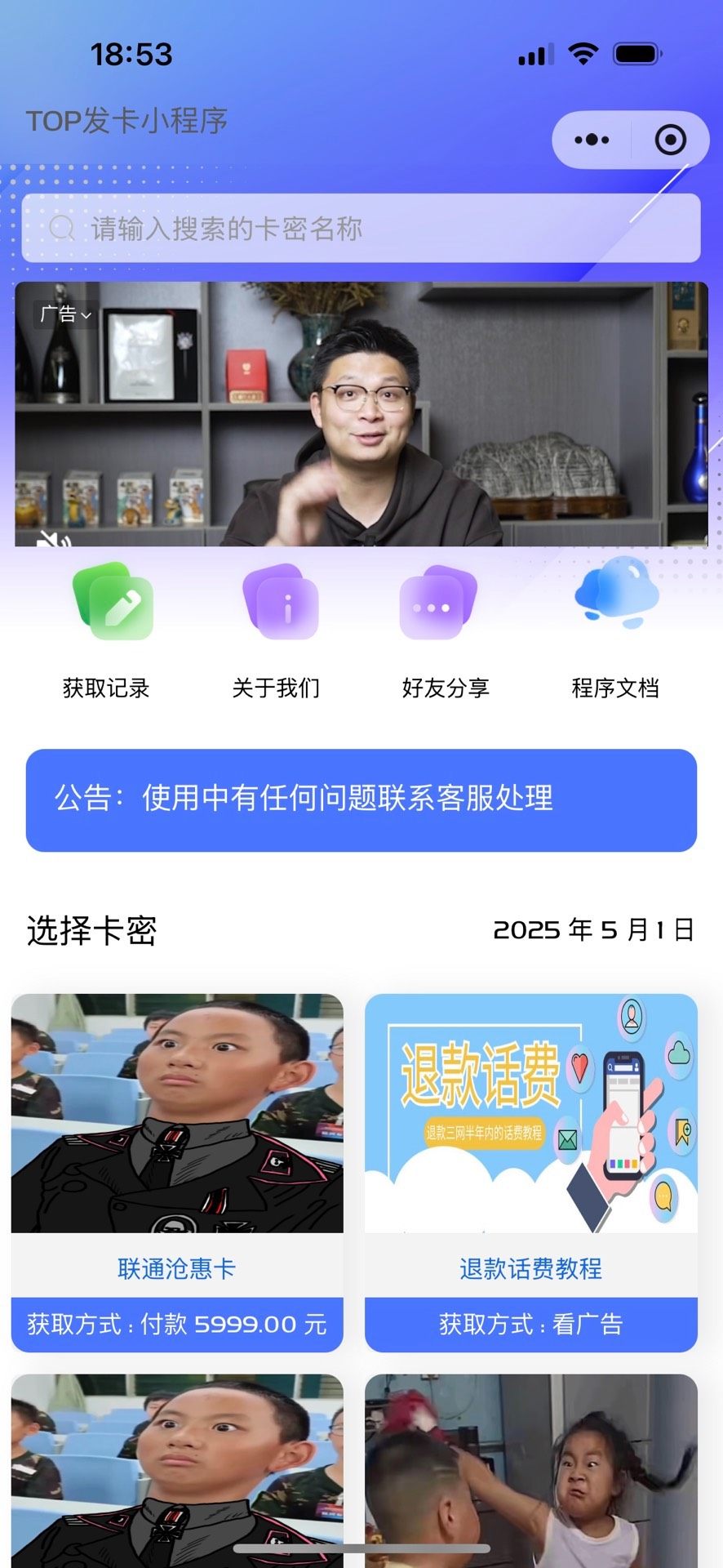 本套发卡小程序源码不仅具备基础的自动发卡功能,更深度融合视频流量主机制,帮助用户通过广告展示实现持续收入。