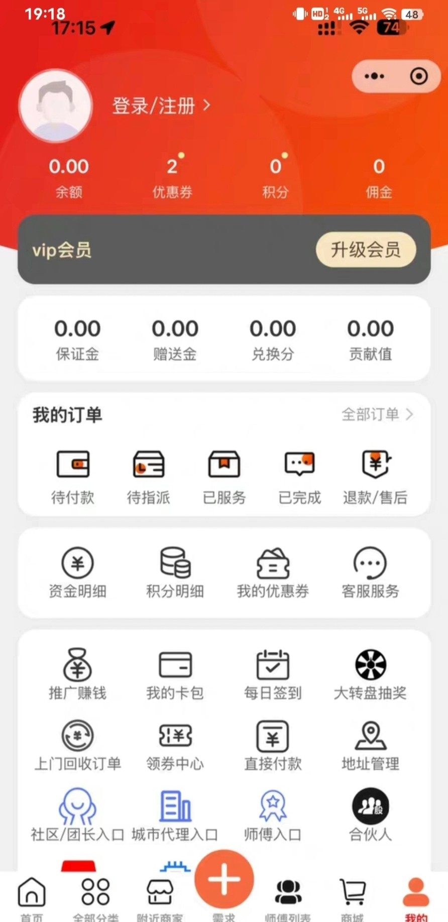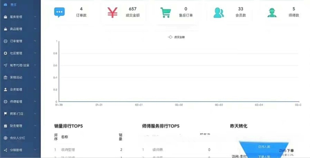 涵盖服务品类管理、标准化商品上架、全流程订单追踪;支持多角色协同——会员下单、师傅接单、商家/服务站点分区域管理;内置财务管理、城市运营配置、二级分销体系及营销工具(优惠券、拼团、限时秒杀)。