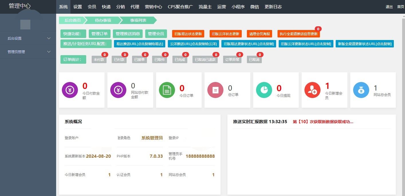 后台集成了丰富的管理功能,涵盖订单、会员、代理、财务等多个维度。