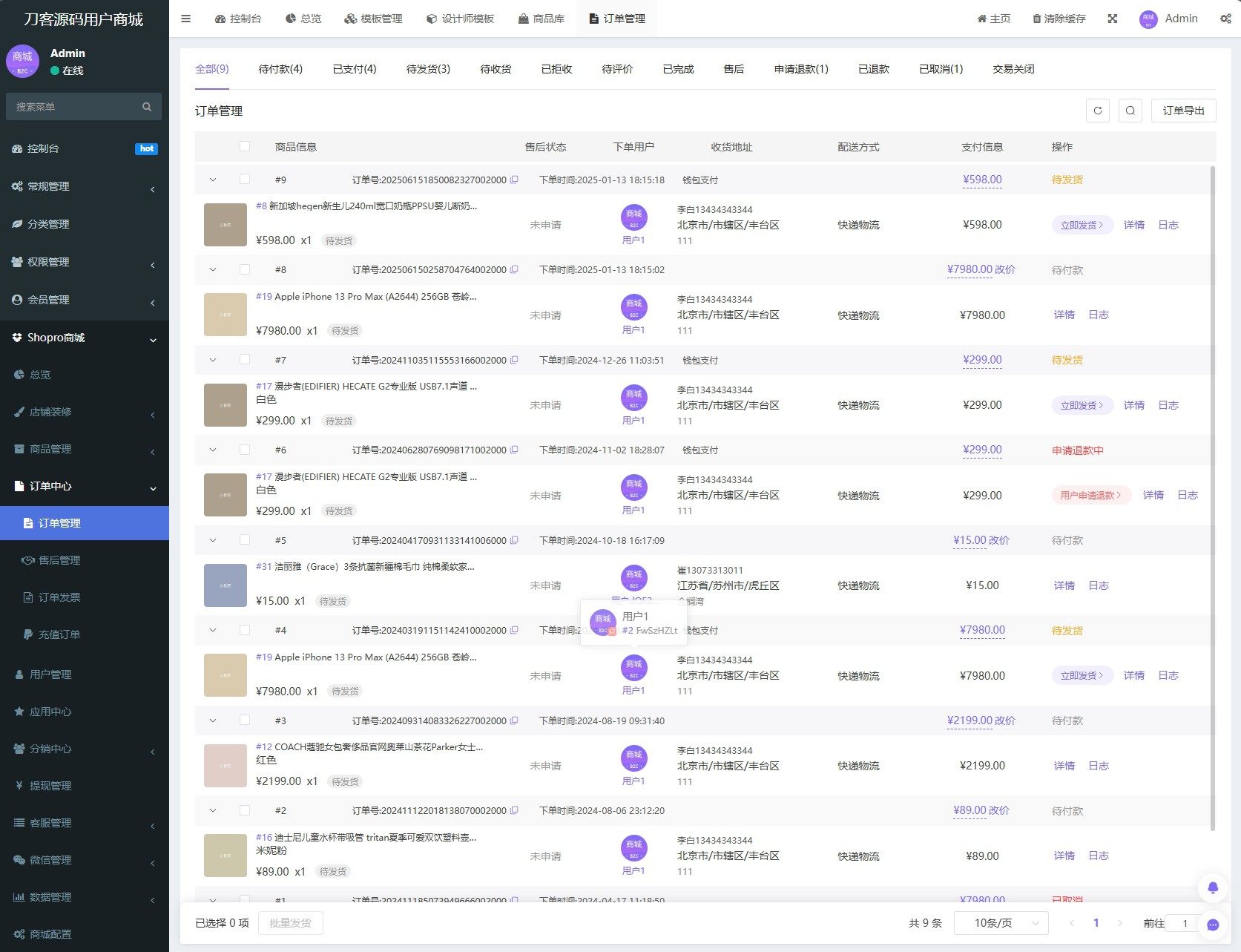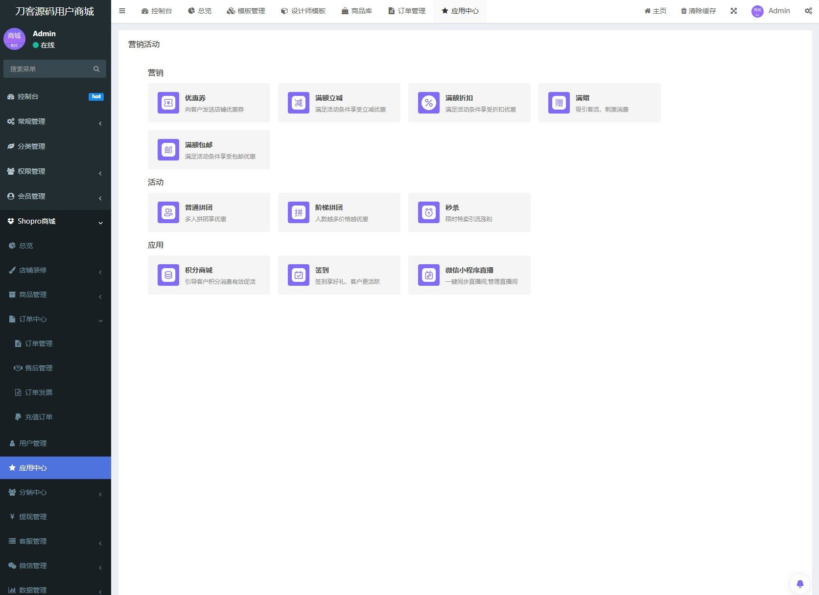系统已集成拼团砍价、购物返积分、优惠券裂变、会员等级体系、小程序直播接入(兼容腾讯云TRTC)、多客服系统(支持网页/小程序/APP三端消息互通)、订单自动分账、分销推广等10+实用功能模块,开箱即用,无需二次开发基础营销能力。