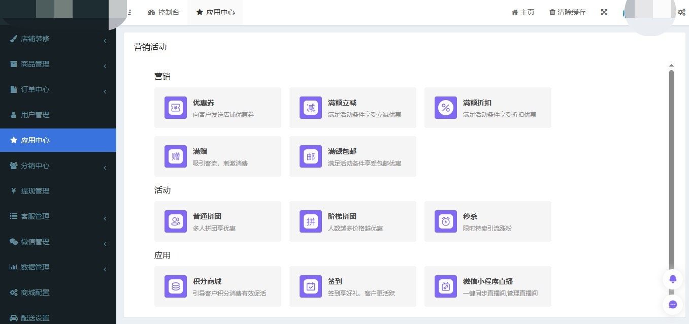 内置多种高效营销活动插件,涵盖优惠券发放、满减促销、满额折扣、买赠活动、包邮设置等功能,全面激发用户欲望。