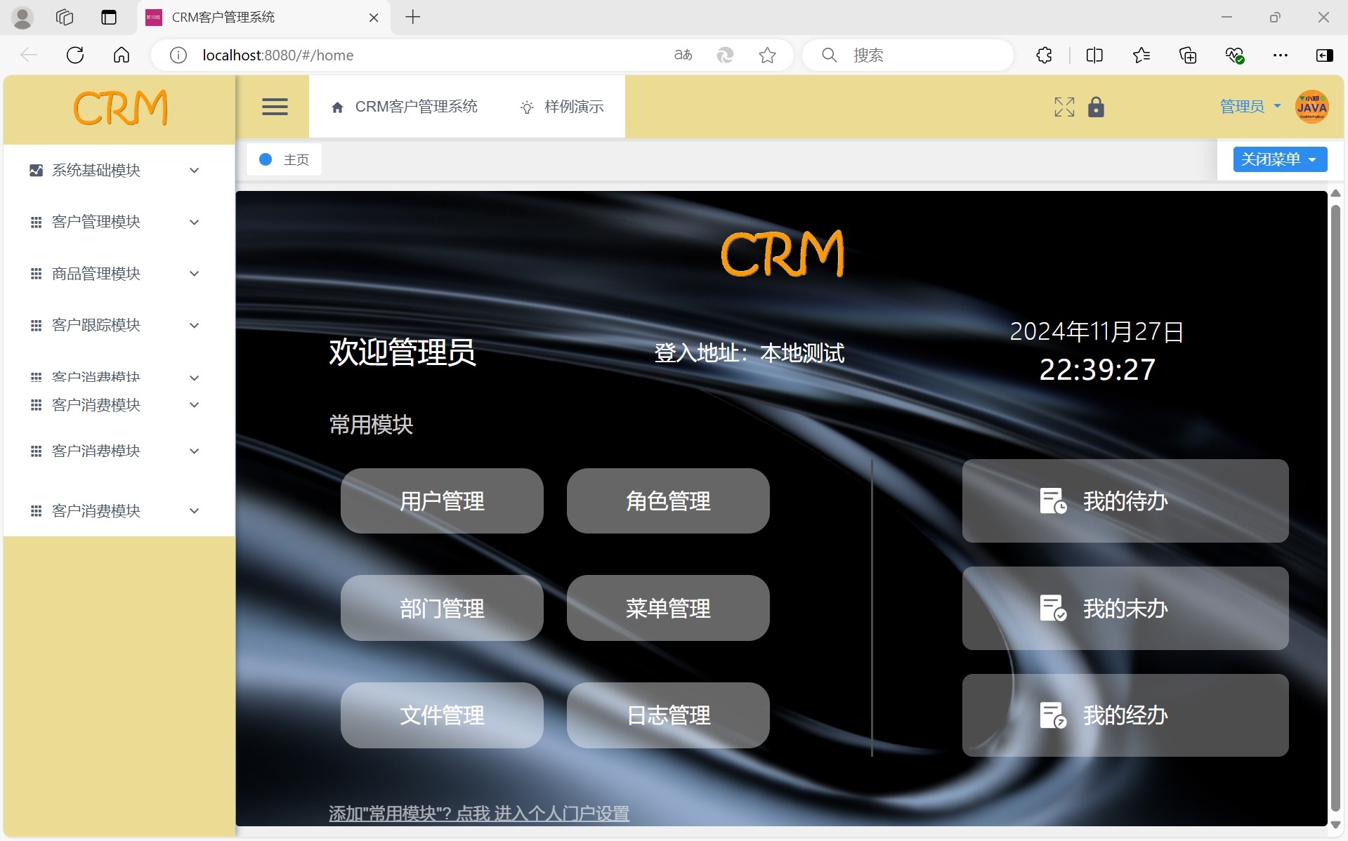 本系统是一款专为现代企业设计的CRM客户管理系统,采用当前主流的前后端分离开发模式,前端基于Vue框架构建,后端使用SpringBoot提供稳定服务,具备良好的可维护性与扩展性,适合各类中小型企业快速部署使用。