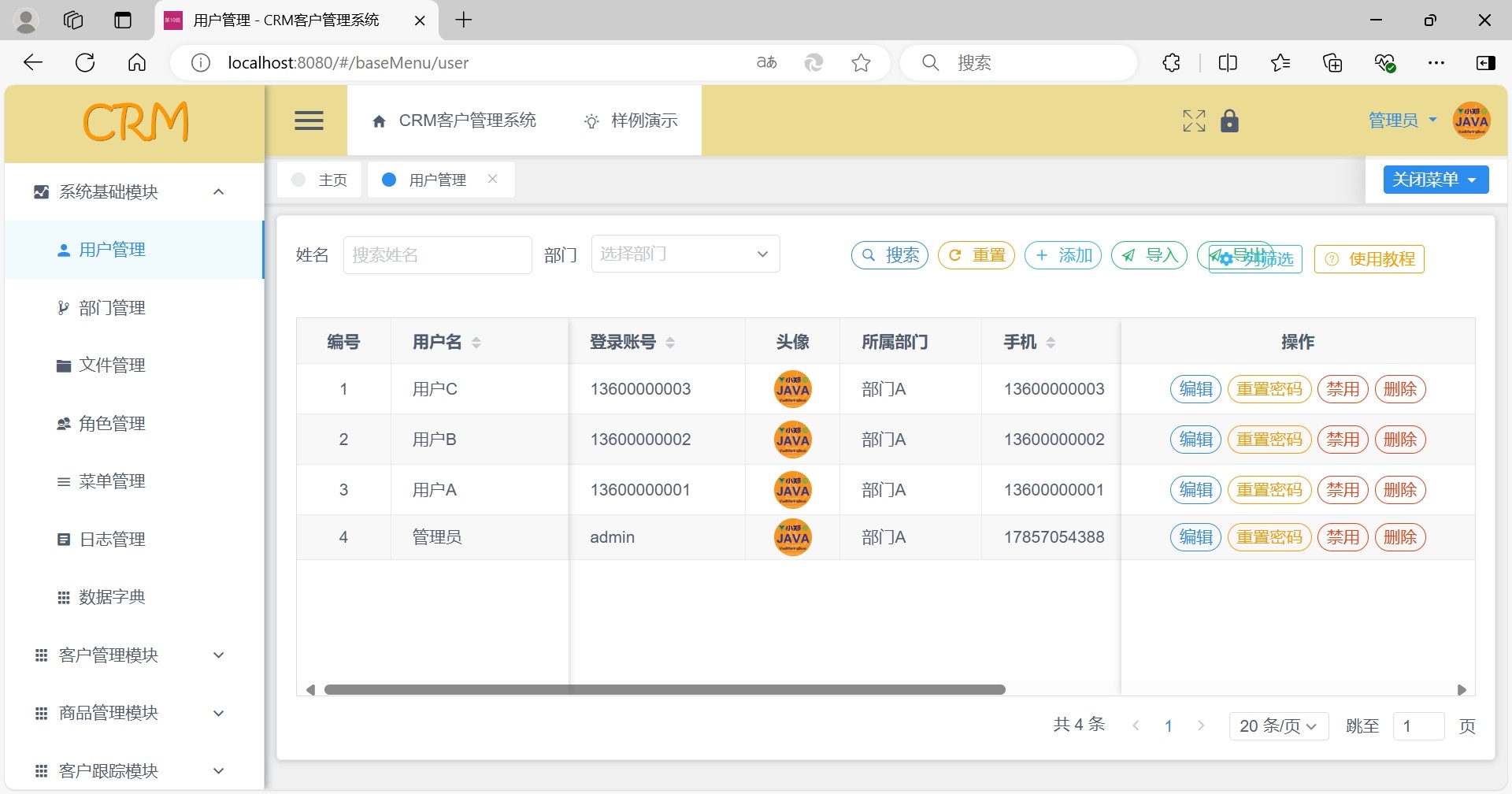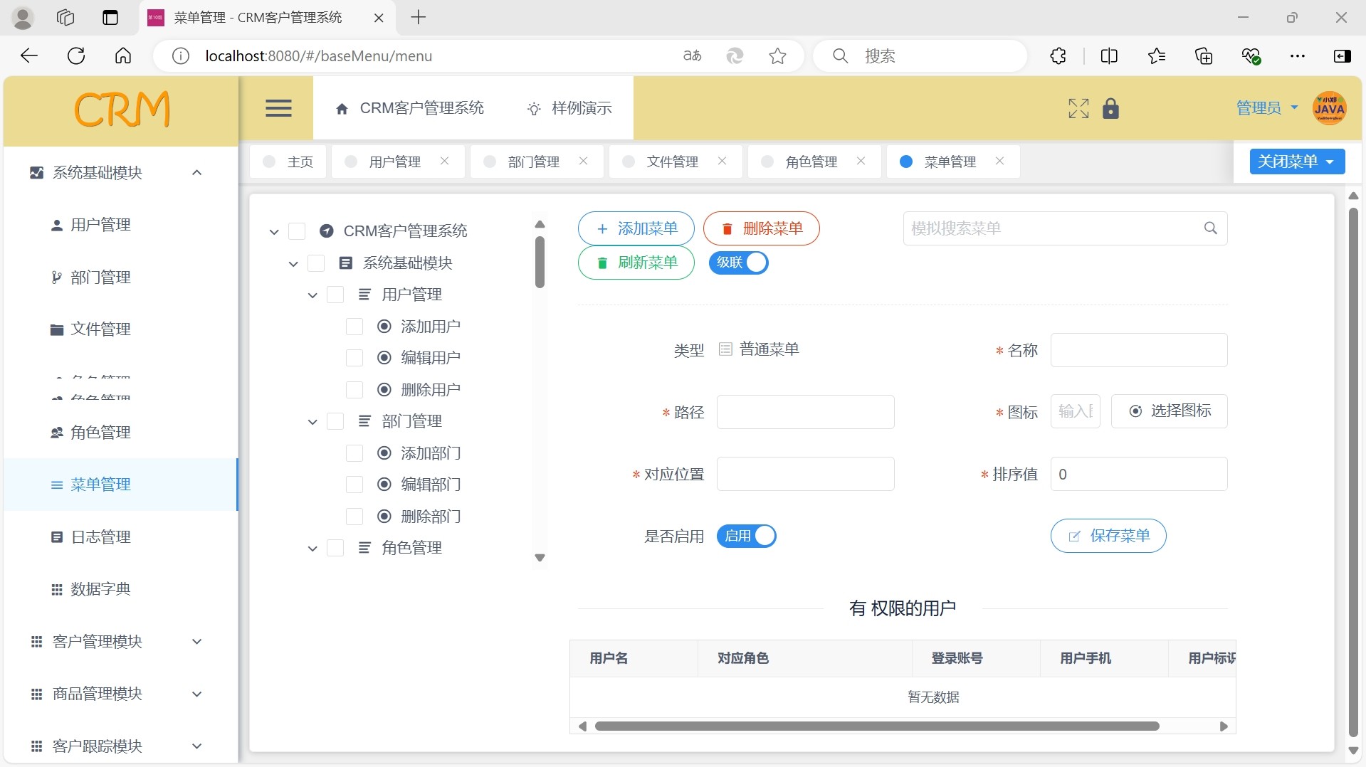 系统内置多项核心管理功能,涵盖用户管理、角色权限控制、菜单配置、部门组织架构管理等基础模块,同时集成客户信息管理、跟进记录、销售流程跟踪等CRM核心功能,帮助企业实现客户资源数字化、流程化管理。