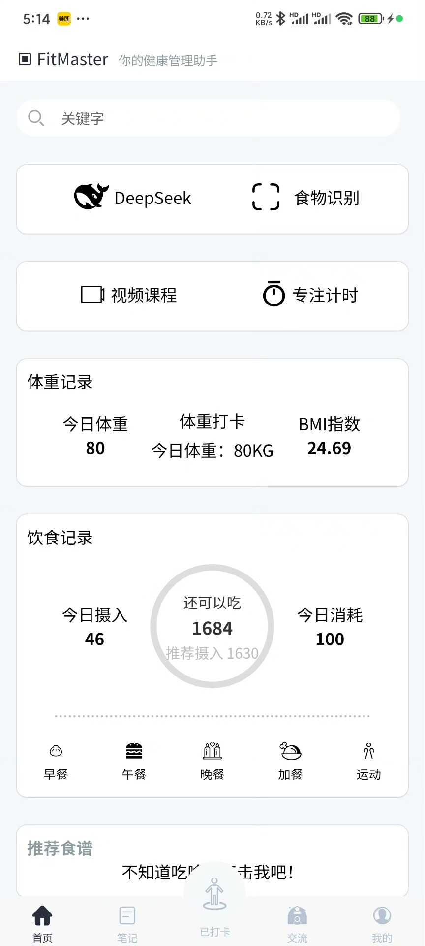 系统完整复刻薄荷健康App核心能力,涵盖食物库检索、手动/扫码录入饮食、自动计算卡路里摄入、运动类型匹配与实时消耗估算,支持日/周维度健康数据可视化分析,助用户科学控脂减重。