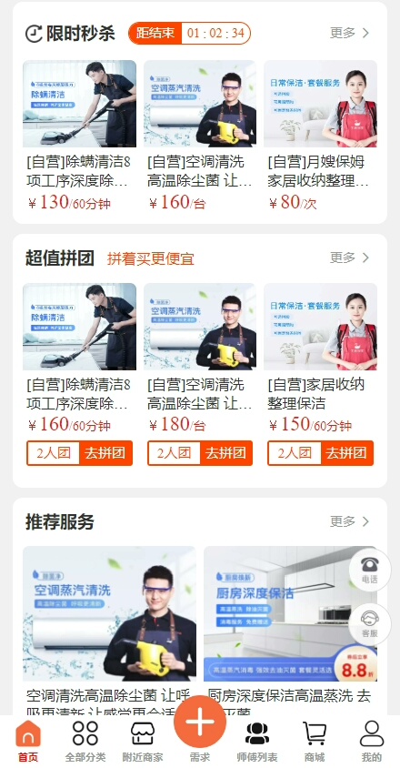 除基础保洁、维修、月嫂等家政服务外,系统原生支持上门回收(旧衣/家电/废品)、社区跑腿(代取快递、代买代办)、房产租售(房源、在线看房、经纪人入驻)等延伸业务,助力商家快速拓展同城O2O生态。