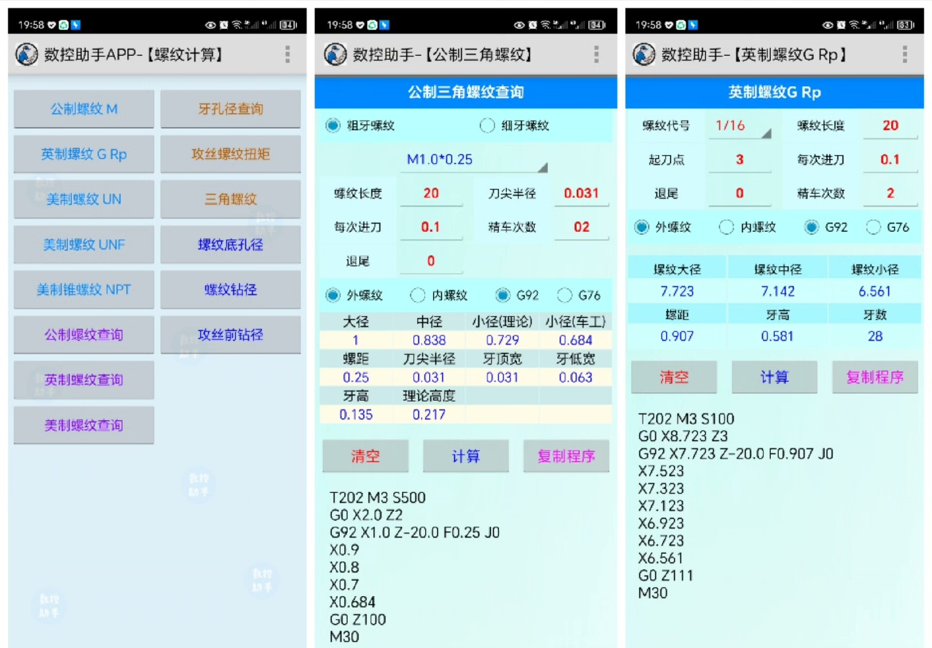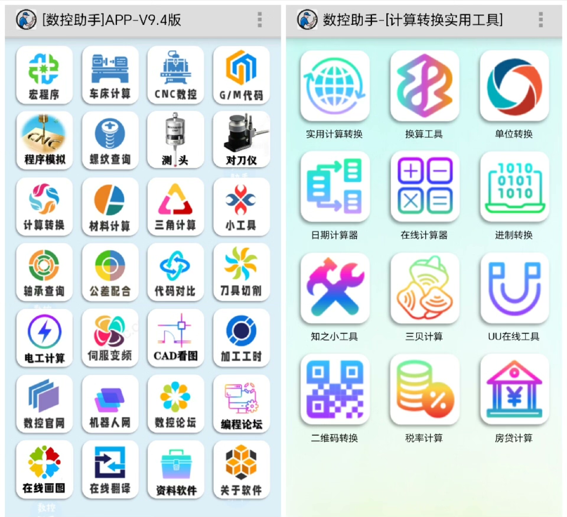内置丰富的实用功能模块:宏程序公式库、轴承型号查询、公差配合计算、FANUC齿轮比分析、PMC中文报警解码、三点定圆心、三角函数运算、进制转换、单位换算(公英制、度分秒)、线速度计算、螺纹牙孔径表、材料重量估算、UG螺旋下刀参数计算,以及车削铣削钻削工艺参数推荐等。