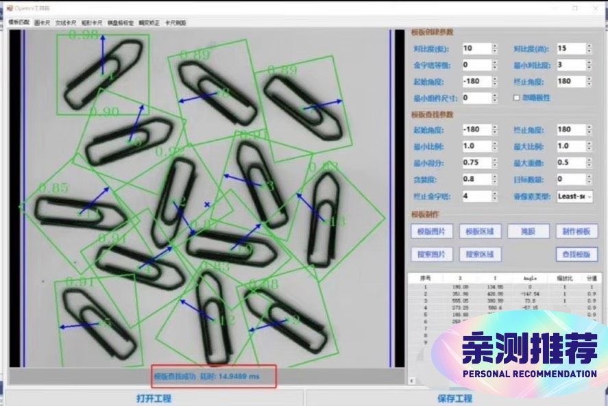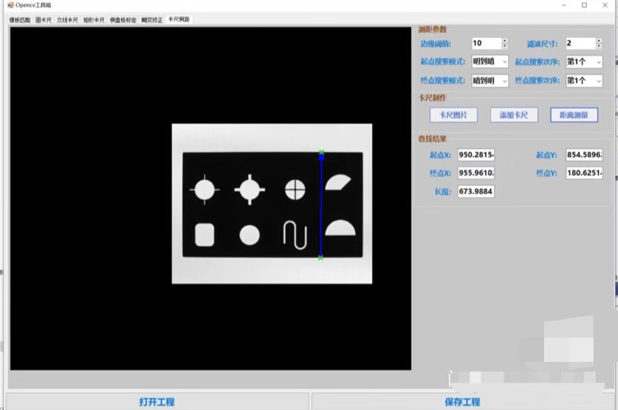 系统不仅实现了高精度的模板匹配(已封装成可调用组件),还包含完整的找线、找圆、找矩形以及多种卡尺测距功能。