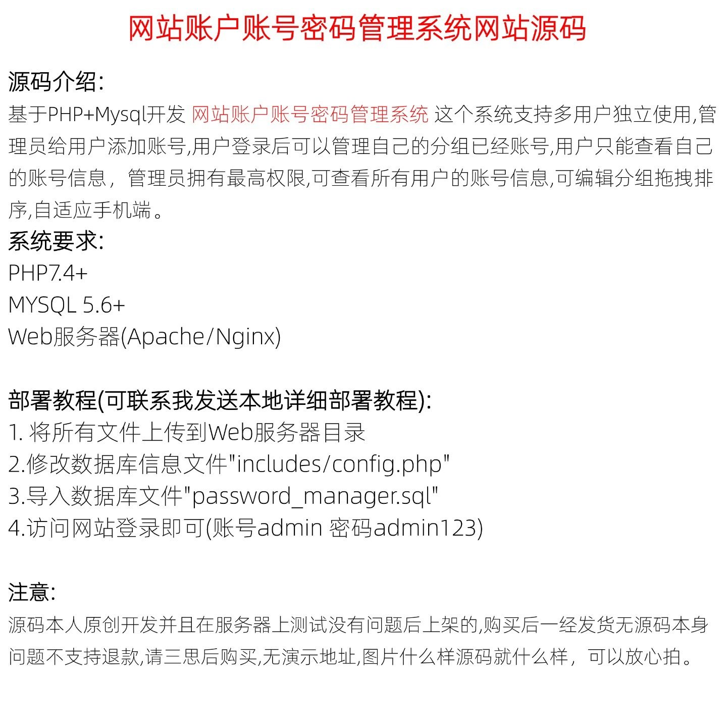 本系统是一款功能完善的网站账号密码管理平台,采用PHP7.4以上版本与MYSQL5.6+数据库开发,兼容Apache和Nginx等主流Web服务器环境。