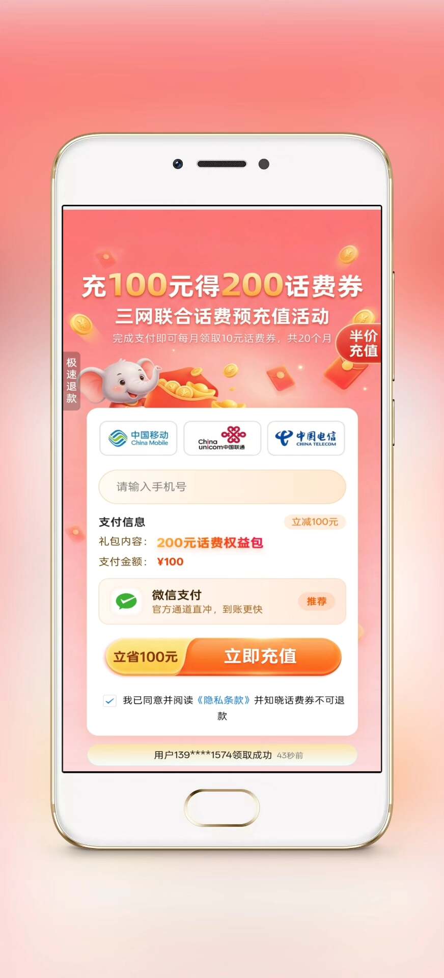 【用户福利】每月自动发放10元话费抵扣券,连续享满20个月
